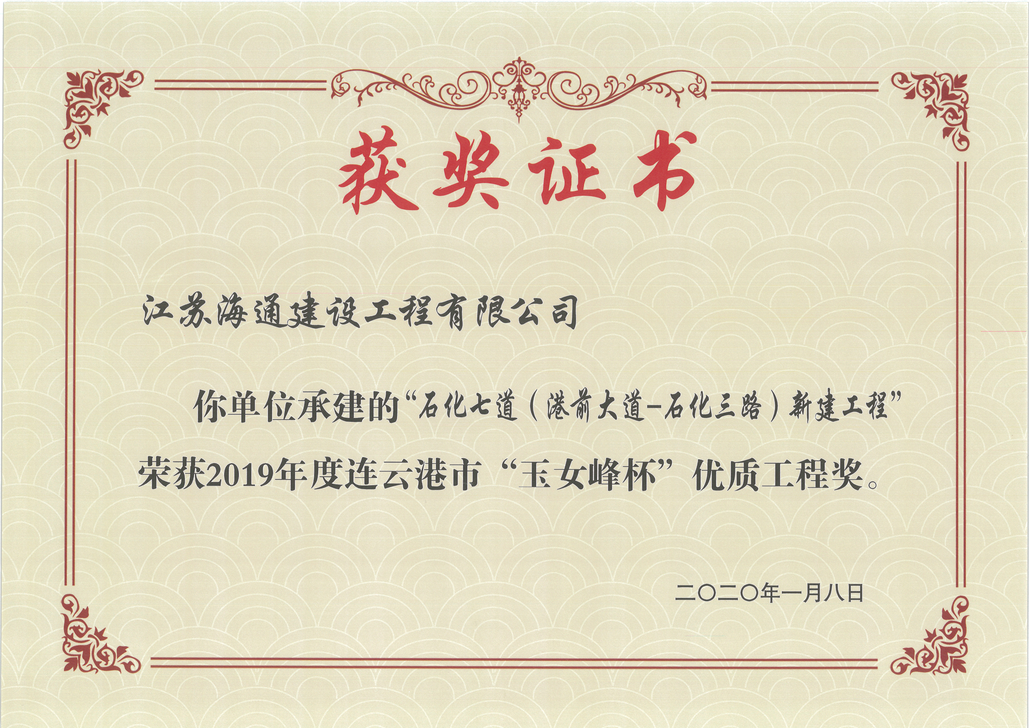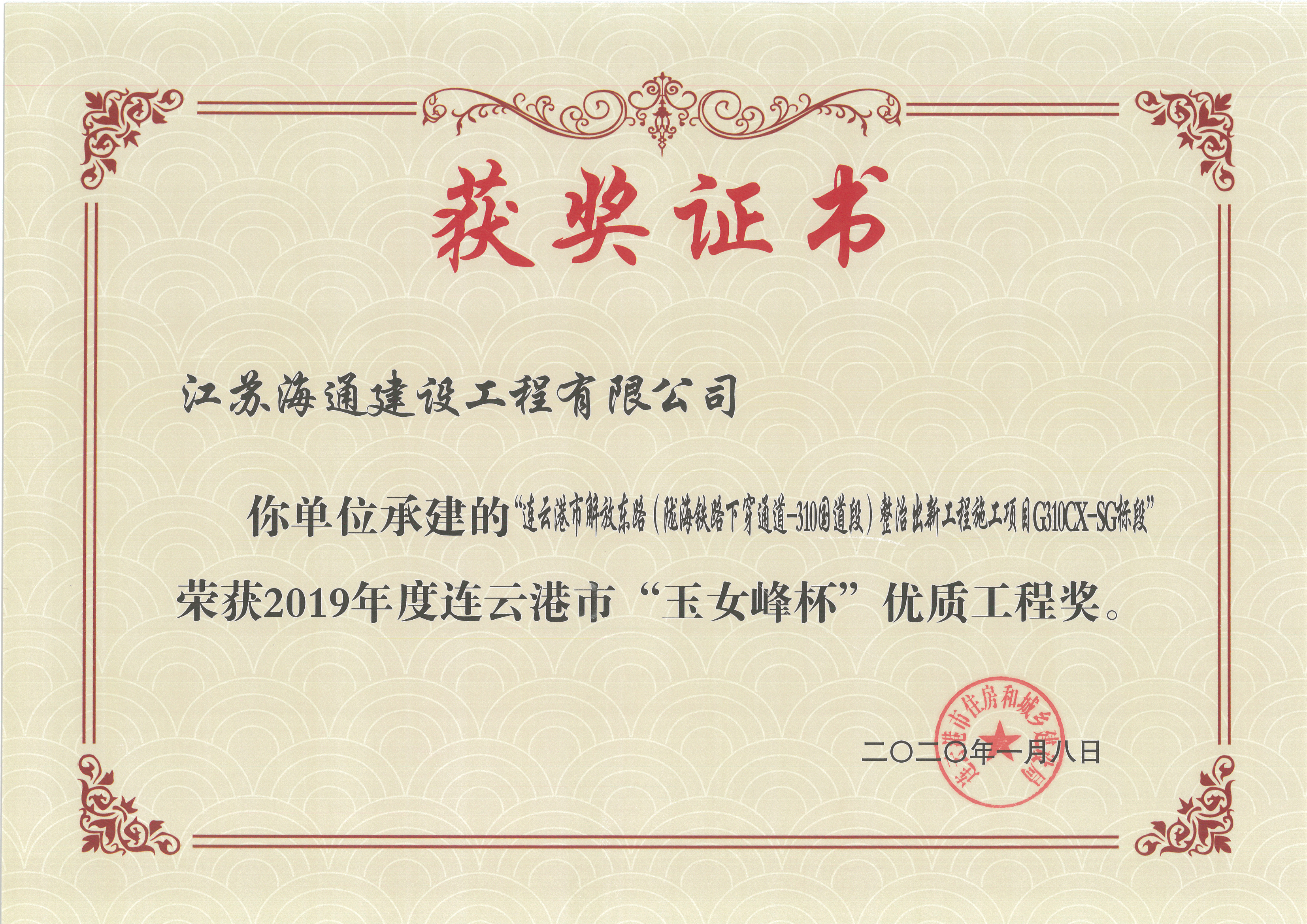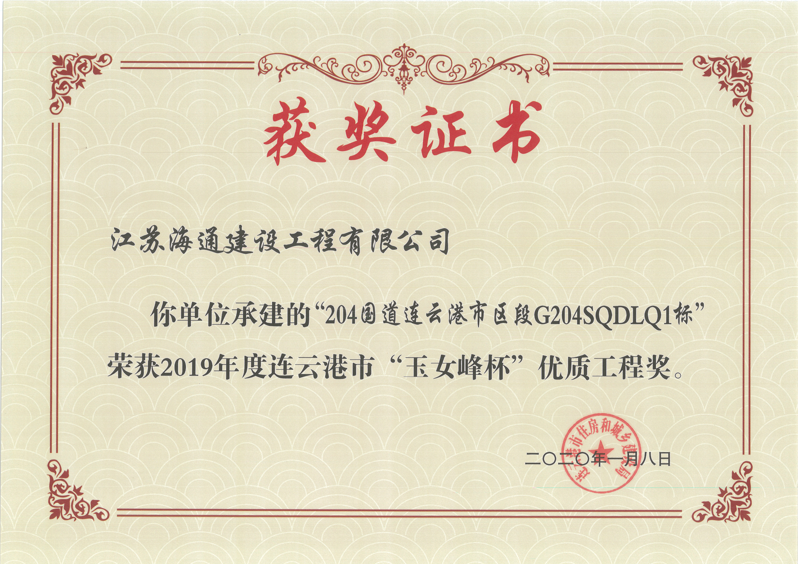 4月23日,连云港市住建局颁发了2019年连云港市“玉女峰杯”优质工程奖奖状。江苏海建公司申报的“204国道连云港新浦至灌南段改扩建工程市区段路面施工项目G204SQDLM1标段”、“204国道连云港市区段G204SQDLQ1标”、“连云港市解放东路(陇海铁路下穿通道-310国道段)整治出新工程施工项目G310CX-SG标段”和“石化七道(港前大道-石化三路)新建工程”四个项目均获得此项荣誉。