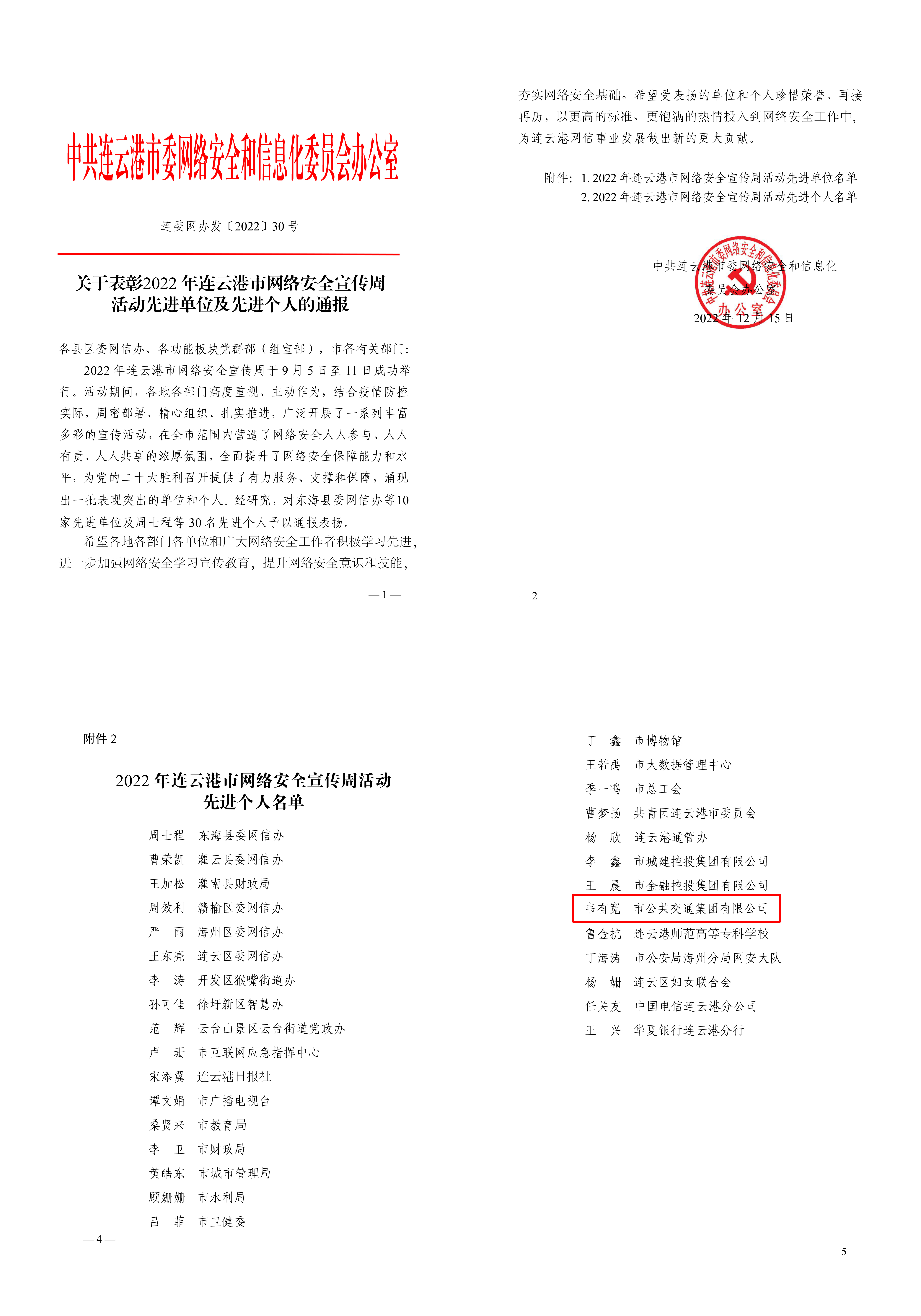 2022年连云港市网络安全宣传周于9月5日至11日成功举行。活动期间,市交通控股集团权属公交集团高度重视,主动作为,广泛开展宣传活动,营造网络安全人人参与、人人有责、人人共享的浓厚氛。公交集团生产运营部韦有宽在宣传活动中表现突出,获得连云港市网络安全宣传周活动先进个人荣誉称号。