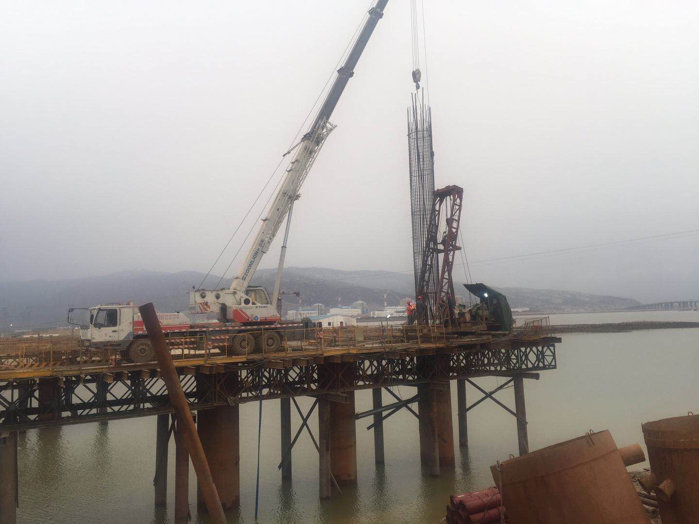 为保障水中桩安全作业,建设单位结合现场施工情况和水文条件,采用搭设钢便桥及平台进行桩基础施工,钢便桥紧挨烧香河桥右侧外边缘平行布置,共搭设四个水中桩施工平台。因水中桩均位于烧香河老闸范围,各种老闸基础给桩基钻进带来巨大困难,同时由于受海水潮汐及海淤影响,前期施工中多次出现穿孔和坍孔等问题,市交通控股集团宿徐路现场办及时组织监理、设计及施工单位多次商讨施工方案,调整施工工艺,经过三轮试打,3月31日首根水中桩终于浇筑成功,给后续水中桩基施工积累了重要经验,也为宿徐路年底全线贯通打下坚实基础。