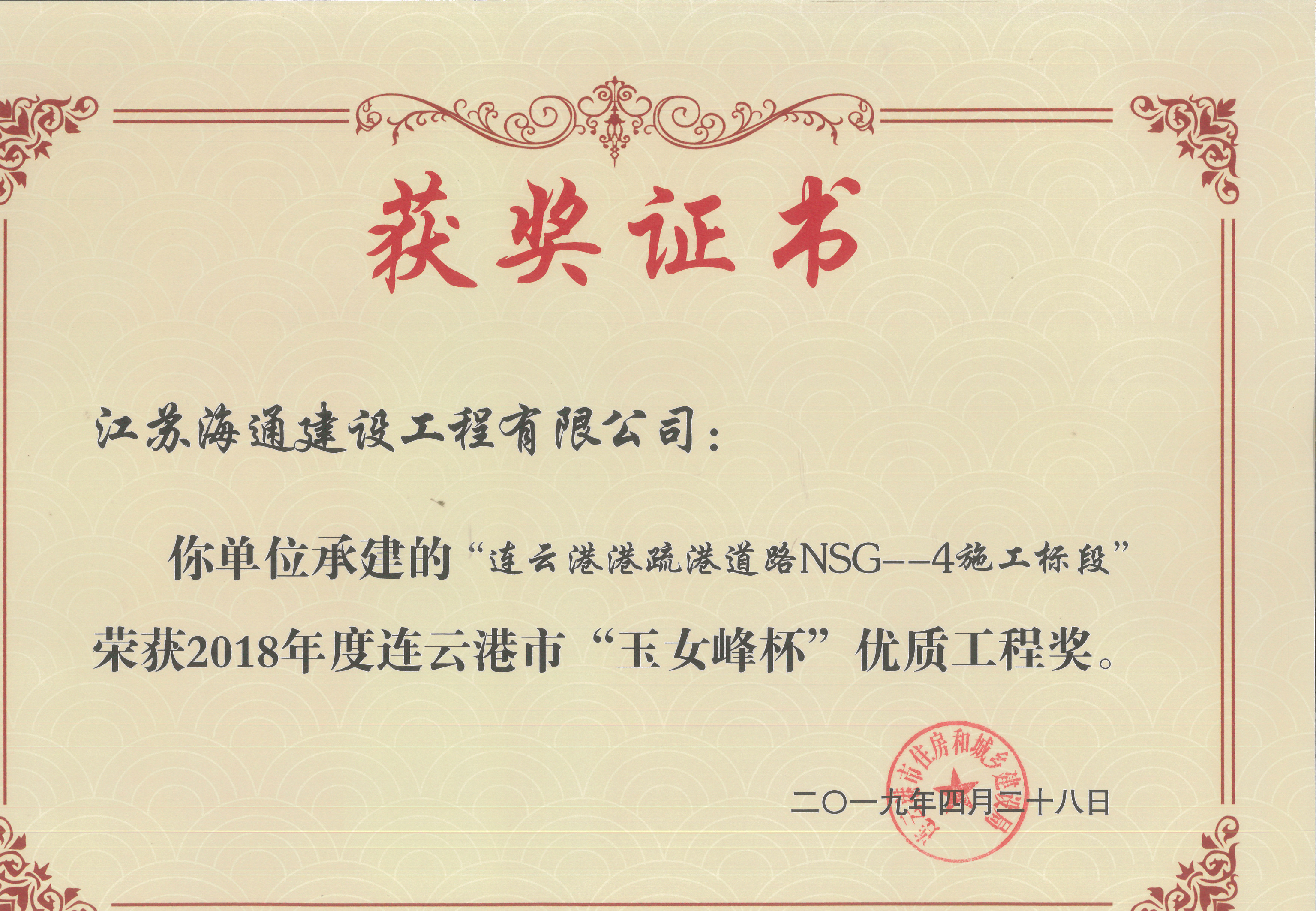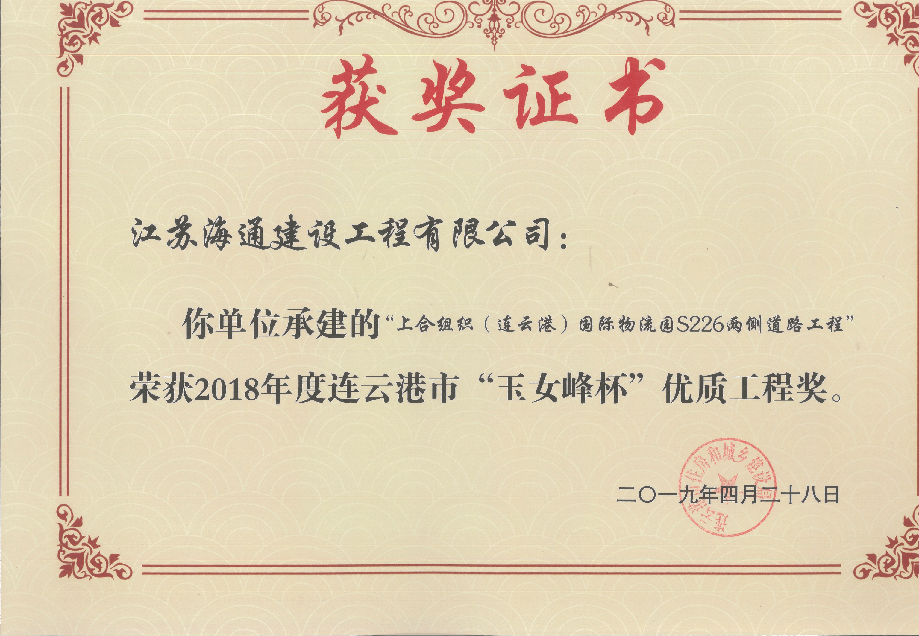 近日,连云港市住房和城乡建设局下发了文件《关于公布2018年度连云港市“玉女峰杯”优质工程项目奖的决定》(连建质〔2019〕167号) ,江苏海建公司申报的两个项目“连云港港疏港道路NSG--4施工标段”和“上合组织(连云港)国际物流园S226两侧道路工程”顺利通过了专家组的评审,被评为2018年度连云港市“玉女峰杯”优质工程奖。