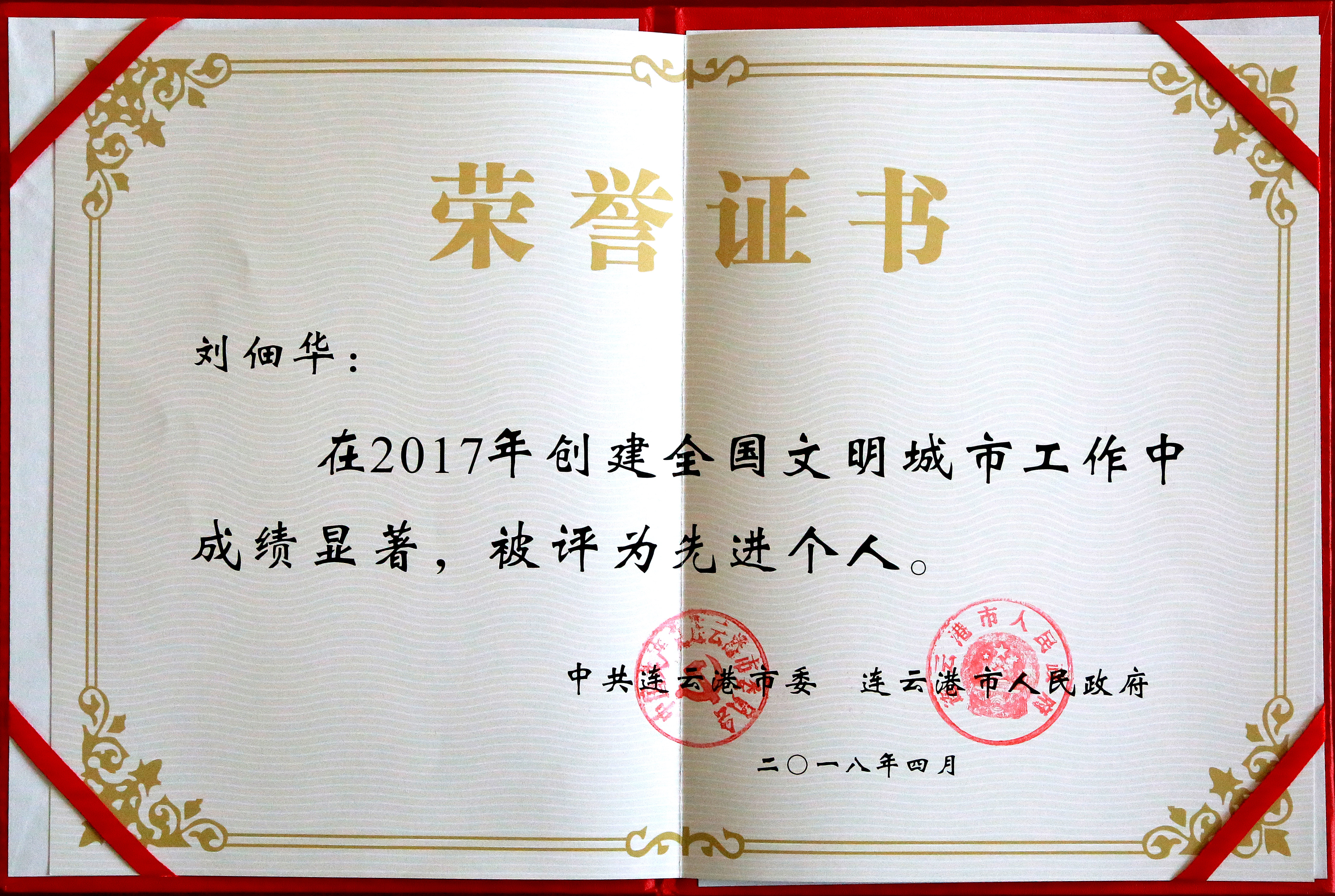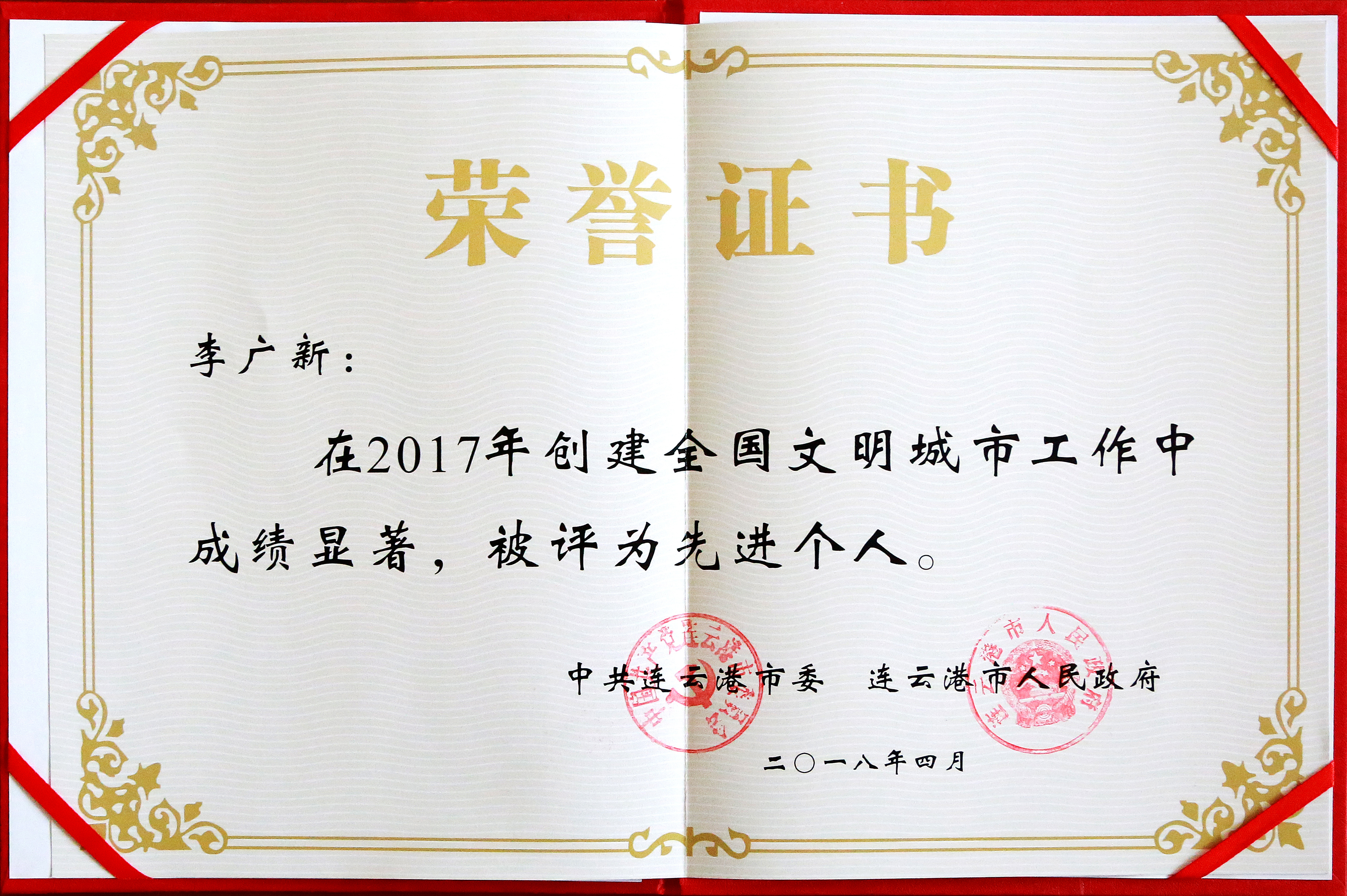4月18日,从市委市政府获悉,集团被评为2017年创建全国文明城市工作先进单位,徐士斌、刘佃华、李广新被评为2017年创建全国文明城市工作先进个人。