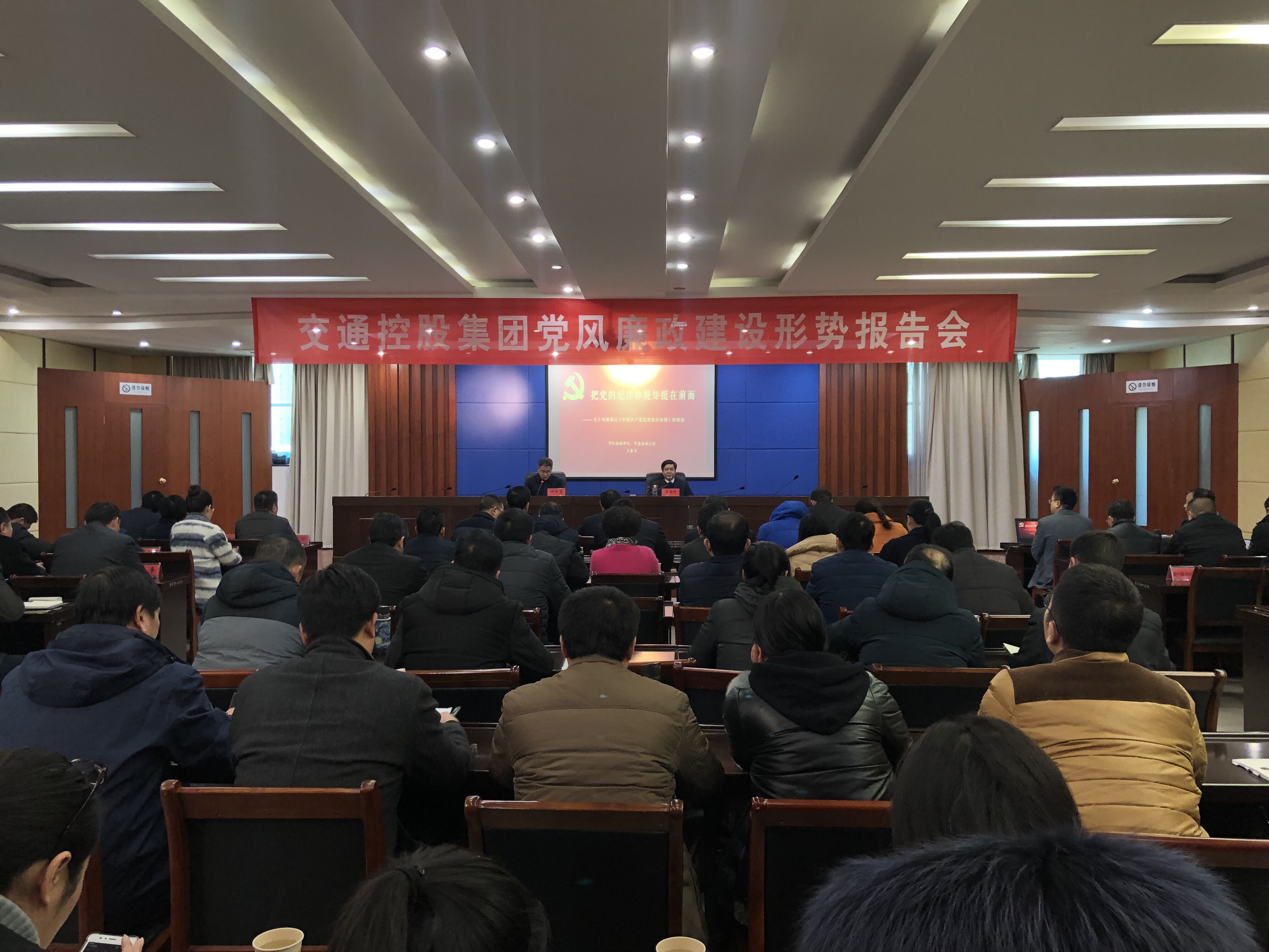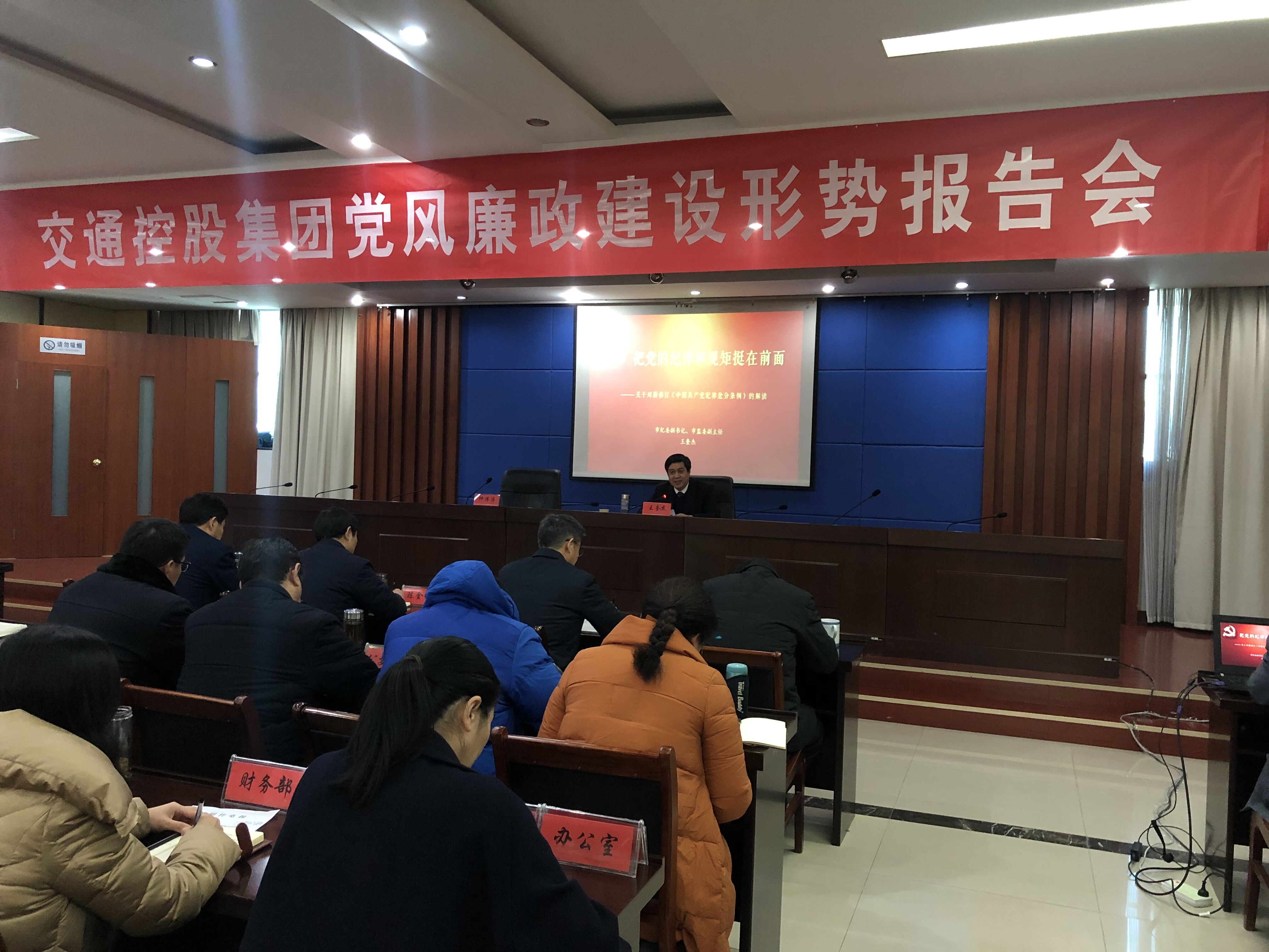 1月16日下午,集团召开党风廉政建设形势报告会,特邀市纪委副书记、市监委副主任王奎杰对《中国共产党纪律处分条例》进行专题解读。集团领导班子成员、集团各部门主要负责人、各权属单位班子成员及相关部门负责人参加会议,集团总经理仲伟涛主持会议。