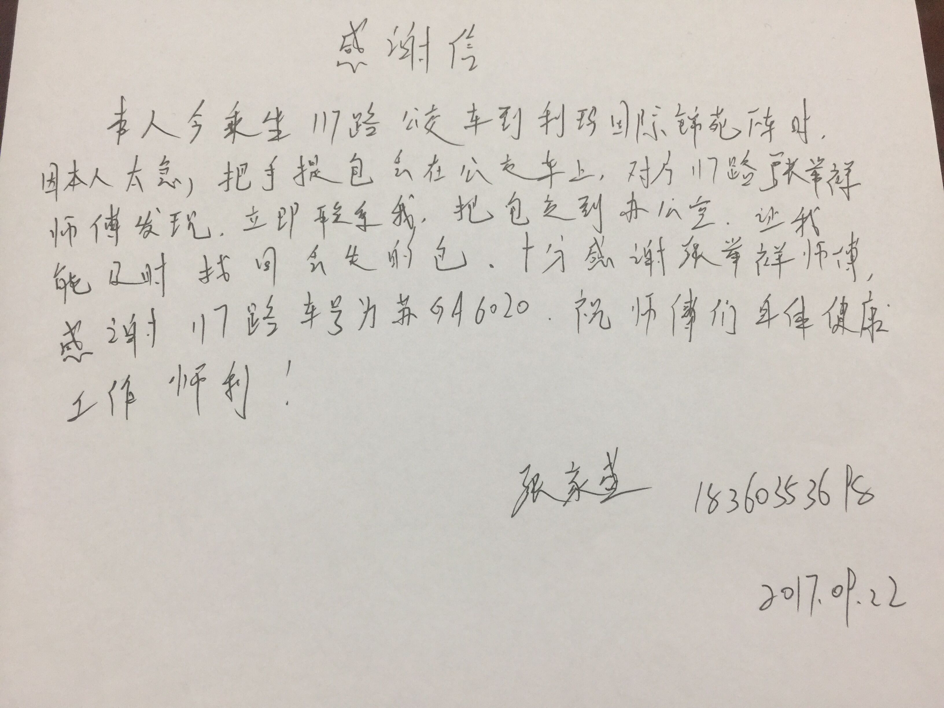 当日傍晚,张先生来到公交新浦公司车队,经过核实无误后工作人员将手提包物归原主,张先生为表谢意,留下了一封感谢信,并祝驾驶员张师傅身体健康,工作顺利!