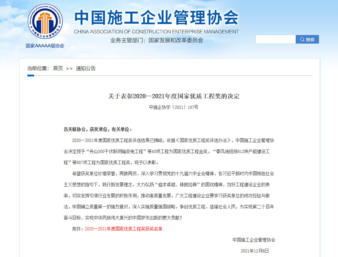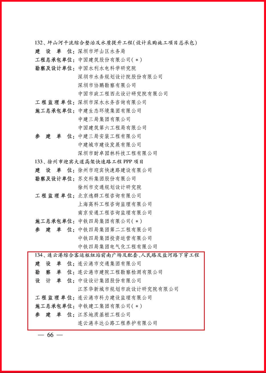 12月6日,中国施工企业管理协会发布《关于表彰2020-2021年度国家优质工程奖的决定》(中施企协字〔2021〕107号),由集团权属交通集团建设的连云港综合客运枢纽站前南广场及配套、人民路及盐河路下穿工程喜获国家优质工程奖。