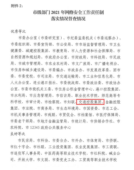 日前,市网信办通报2021年度全市党委(党组)网络安全工作责任制落实情况督查检查结果,集团被评为优秀等次。