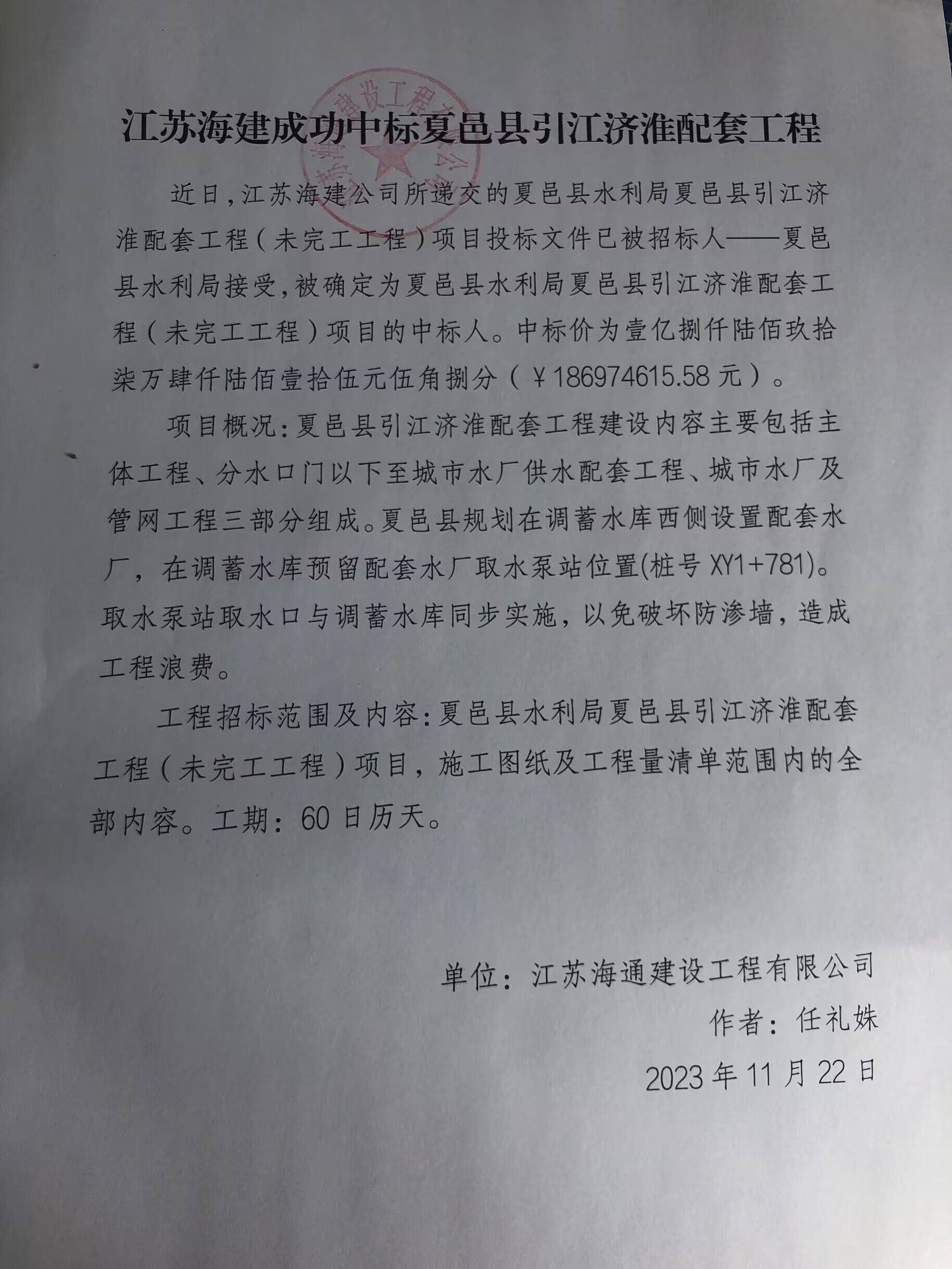 近日,江苏海建公司所递交的夏邑县水利局夏邑县引江济淮配套工程(未完工工程)项目投标文件已被招标人——夏邑县水利局接受,被确定为夏邑县水利局夏邑县引江济淮配套工程(未完工工程)项目的中标人。中标价为壹亿捌仟陆佰玖拾柒万肆仟陆佰壹拾伍元伍角捌分(¥186974615.58元)。