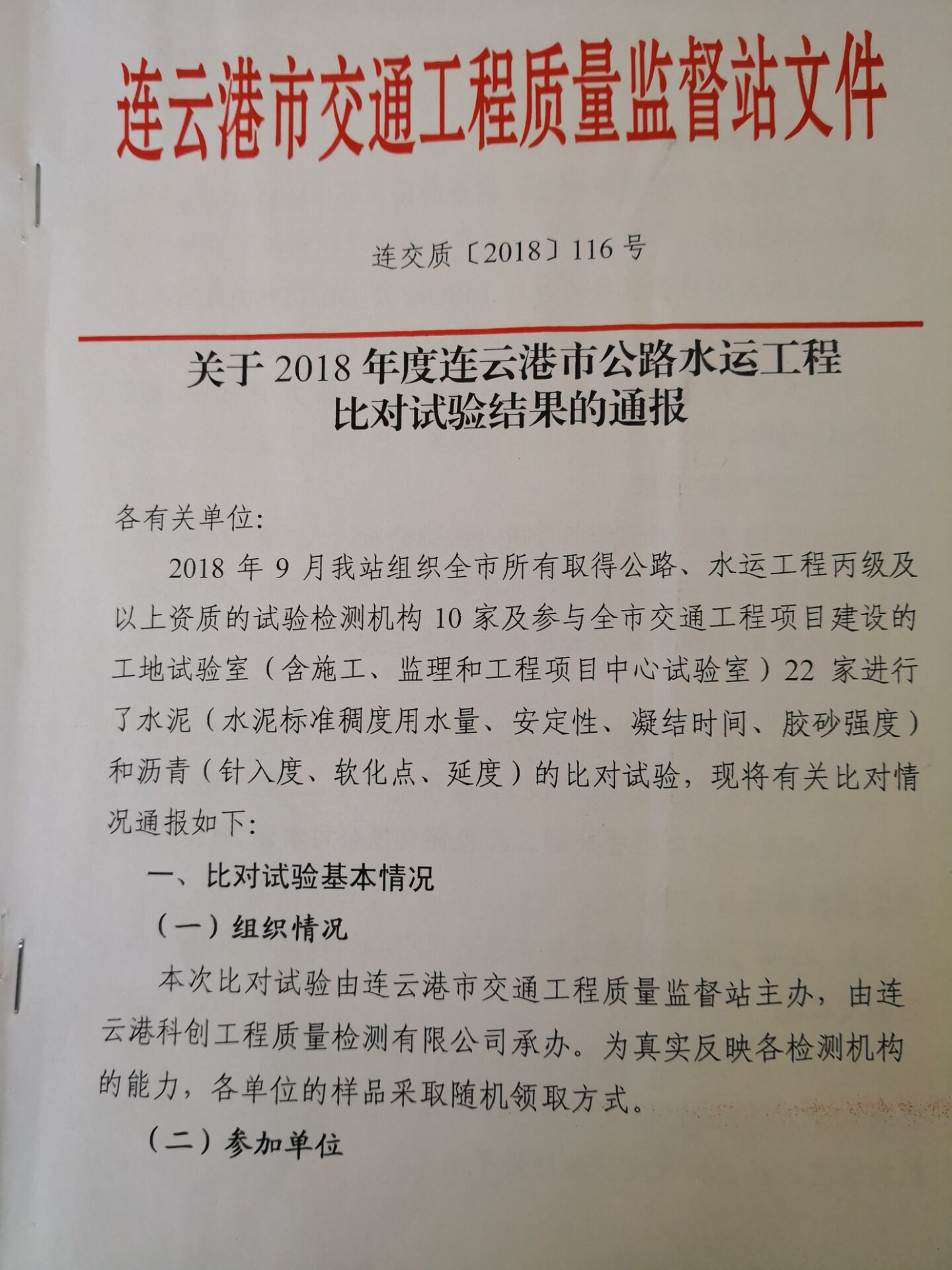 2018年9月,连云港市交通工程质量监督站为进一步提高全市公路水运试验检测水平,提高现场试验检测人员的业务技能,强化质量意识,组织了全市公路水运工程比对试验活动。
