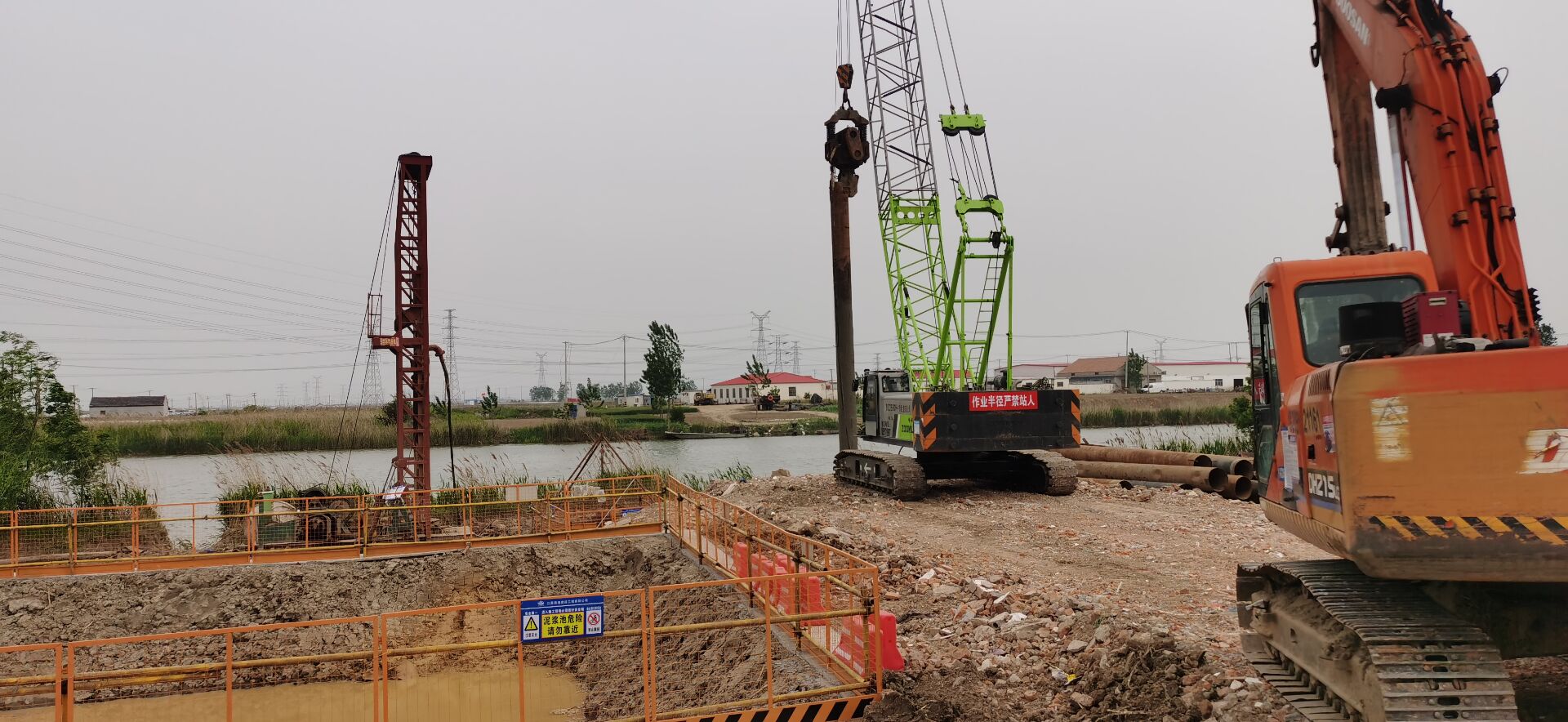 5月6日下午,402省道赣榆南环段路基桥涵工程S402GYNH-SG2标段钢便桥及钻桩平台施工,随着第一根钢管桩的打入,钢便桥及钻桩平台施工顺利开工。钢便桥水中钢管桩共计11跨,9m/跨,全长105m,桥面设计宽度6m,钢便桥左侧设施工平台2座,设计宽度6m,平台总长度36m。钻桩平台2座,设计宽度8m,平台总长度39m。钢便桥及平台两侧设置护栏。场地整平,材料运输、测量放样、机具定位、打入钢管桩等。