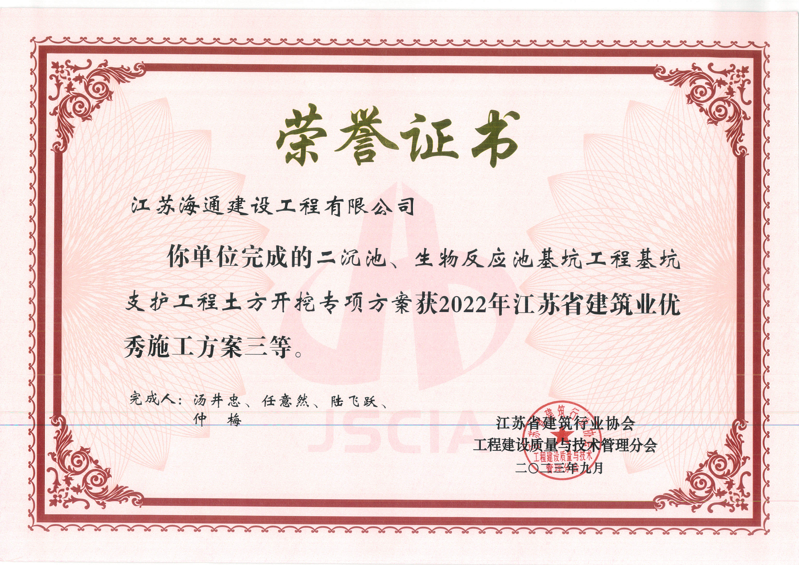日前,从江苏省建筑业协会获悉,江苏海建公司申报的《预应力砼连续箱梁专项施工方案》和《二沉池、生物反应池基坑工程基坑支护工程土方开挖专项方案》两项施工方案分获江苏省建筑业优秀施工方案二等奖和三等奖。