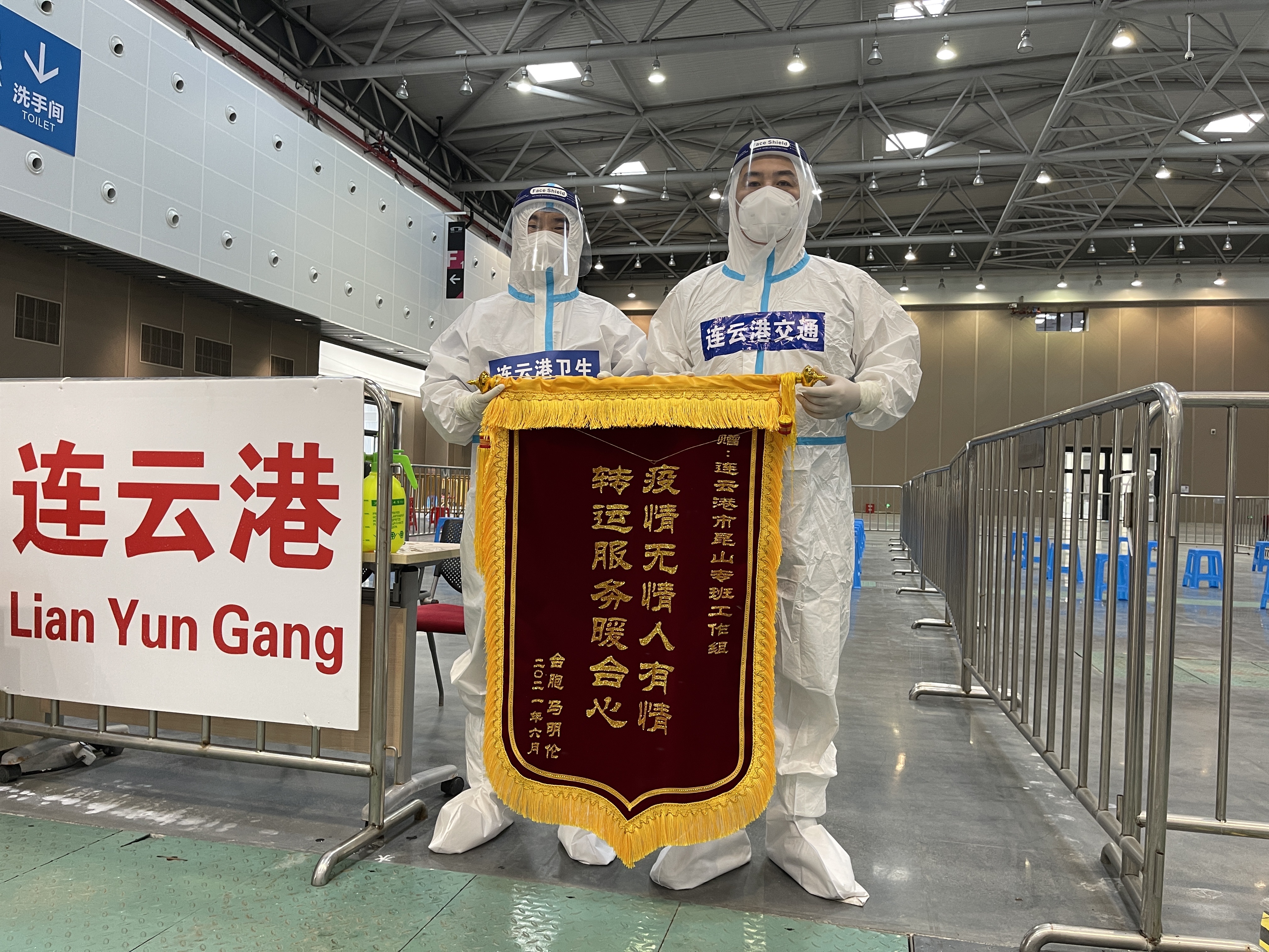 原来,6月25日台胞马明伦夫妇带了两个婴儿和一堆行李,出行非常不放便,在昆山至连云港6个小时的路途中,婴儿冲奶粉成了非常大的问题,提前知道这个情况以后,运输组提前准备了热水,防护物品,在行驶中降低了行驶速度,尽可能的提供舒适的乘坐环境。马明伦夫妇深受感动,真正感受到一家人的温暖。回连后,送来了“疫情无情人有情,转运服务暖台心”锦旗,感谢专班转运组细心体贴的服务。