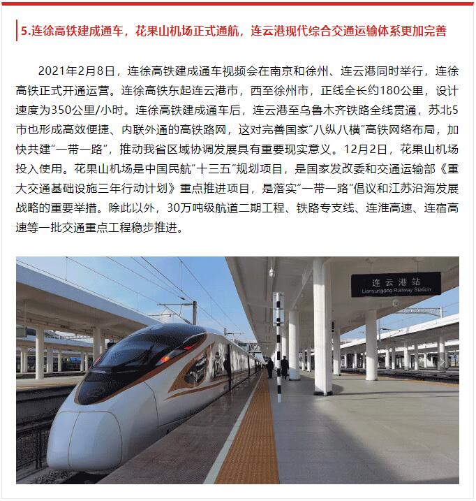 2月8日,由中共连云港市委宣传部主办,连云港报业传媒集团、连云港广电传媒集团承办的2021年度连云港市十大新闻评选揭晓,其中,第5条“连徐高铁建成通车,花果山机场正式通航,连云港现代综合交通运输体系更加完善”和第8条“生态环保成效显著,大气环境质量达2013年以来最优,石梁河水库幸福河湖建设清水进城行动深入推进”均与交通集团相关。原文如下:
