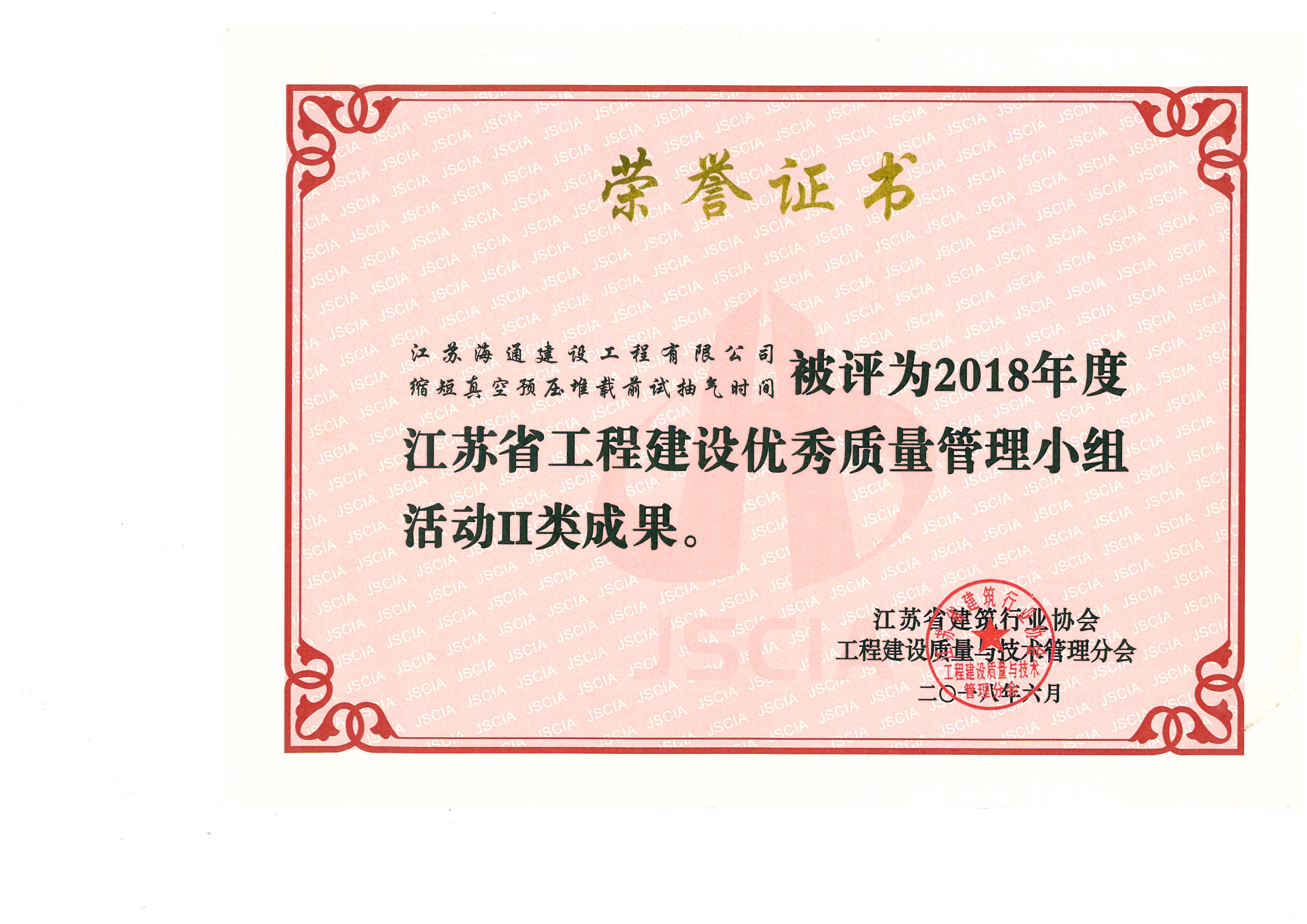 6月14日,从江苏省建筑行业协会传来喜讯,江苏海建公司申报的QC成果《缩短真空预压堆载前试抽气时间》取得优异成绩,在全省587项成果评比中荣获Ⅱ类成果第一名。