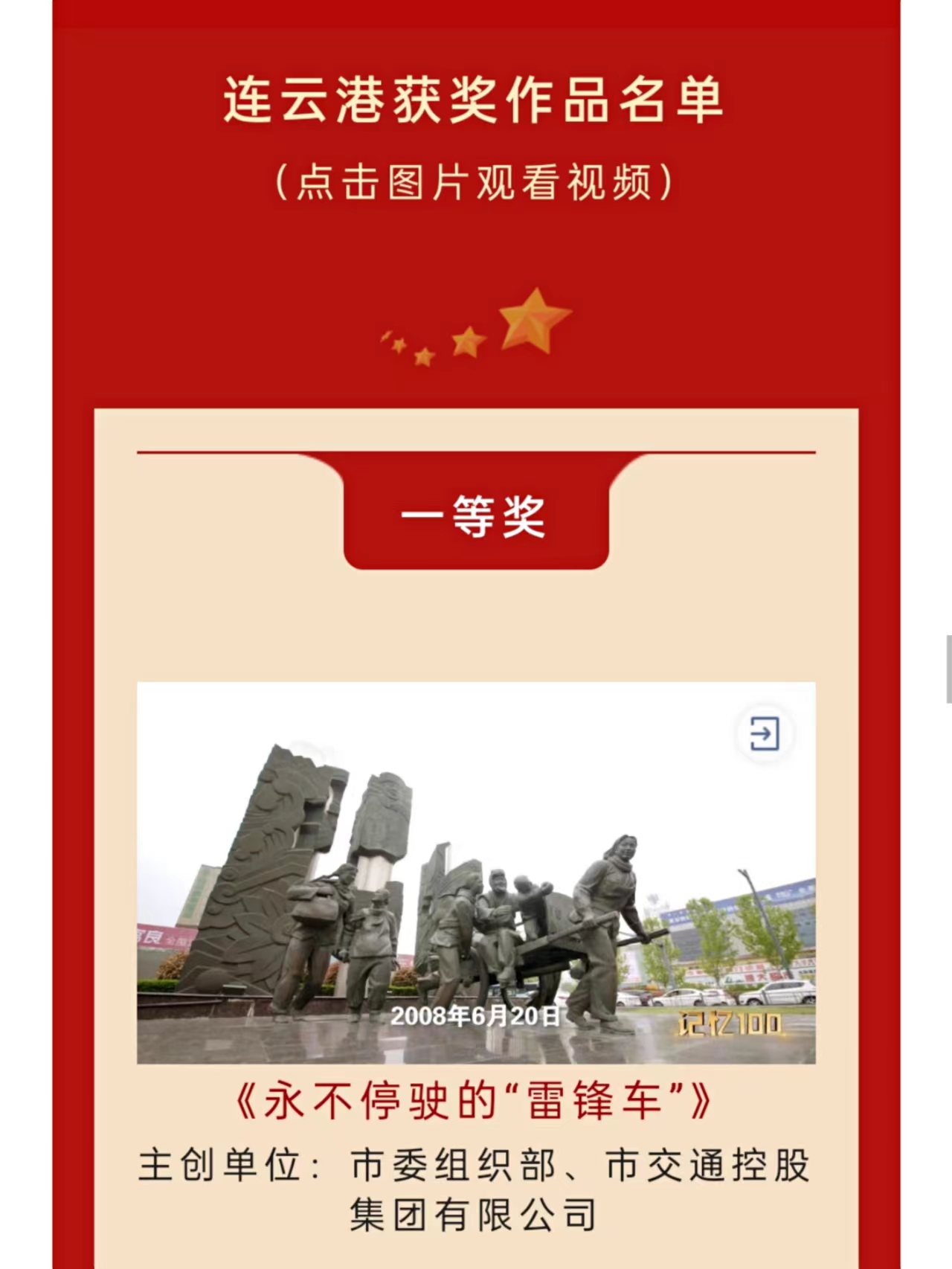 目前,由中央组织部组织开展的第十六届全国党员教育电视片观摩交流活动于近日圆满结束,我站参与创作的《永不停驶的“雷锋车”》,从众多参评的作品中脱颖而出,荣获百集党史微视频《记忆100》一等奖和“五佳策划作品”荣誉称号。