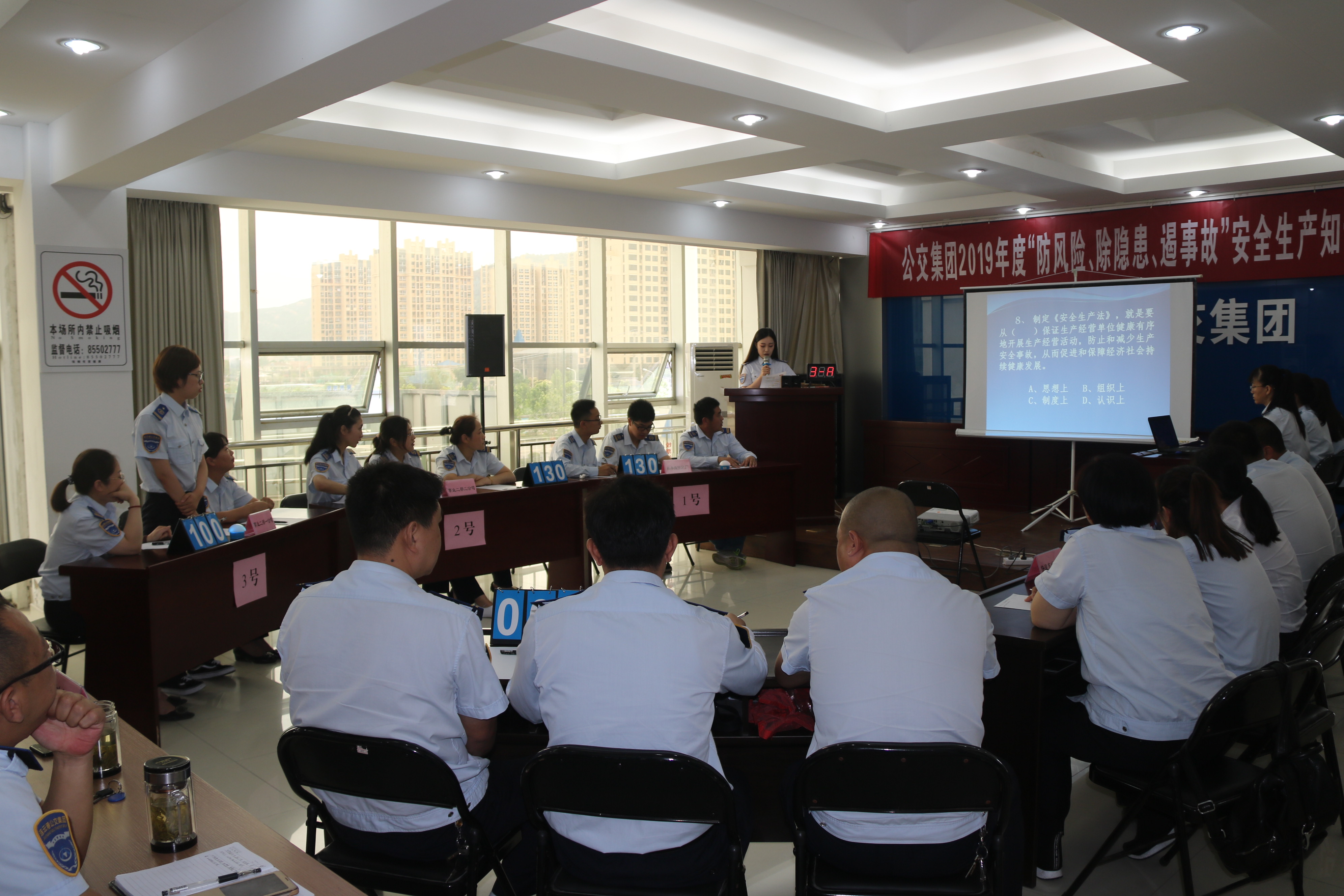 为扎实推进全国第十八个“安全生产月”活动的深入开展,全面加强安全生产宣传教育,普及安全生产知识,提高职工安全素养和自我保护能力,6月27日,公交集团在三楼会议室开展了“防风险、除隐患、遏事故”安全生产知识竞赛,集团党委书记、总经理周文君,副总经理罗军,副总经理、工会主席刘永善,各职能部门负责人及集团权属单位领导班子、安全管理人员共70余人参加了此次活动。