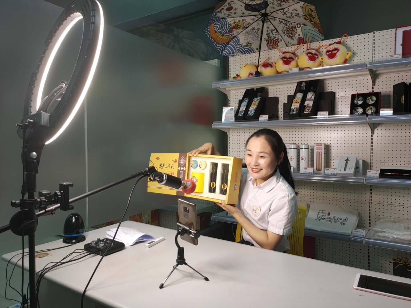 文旅小铺陈列我市特色文化创意类产品、旅游纪念品、非遗伴手礼和地方土特产品,有如意金箍棒钢笔、美猴王茶杯、芭蕉扇书签;花果山的云雾茶、东海桃林的美酒,在您休憩候车之中,享受文化之美;在您旅行途中,为家人带回一份心意。