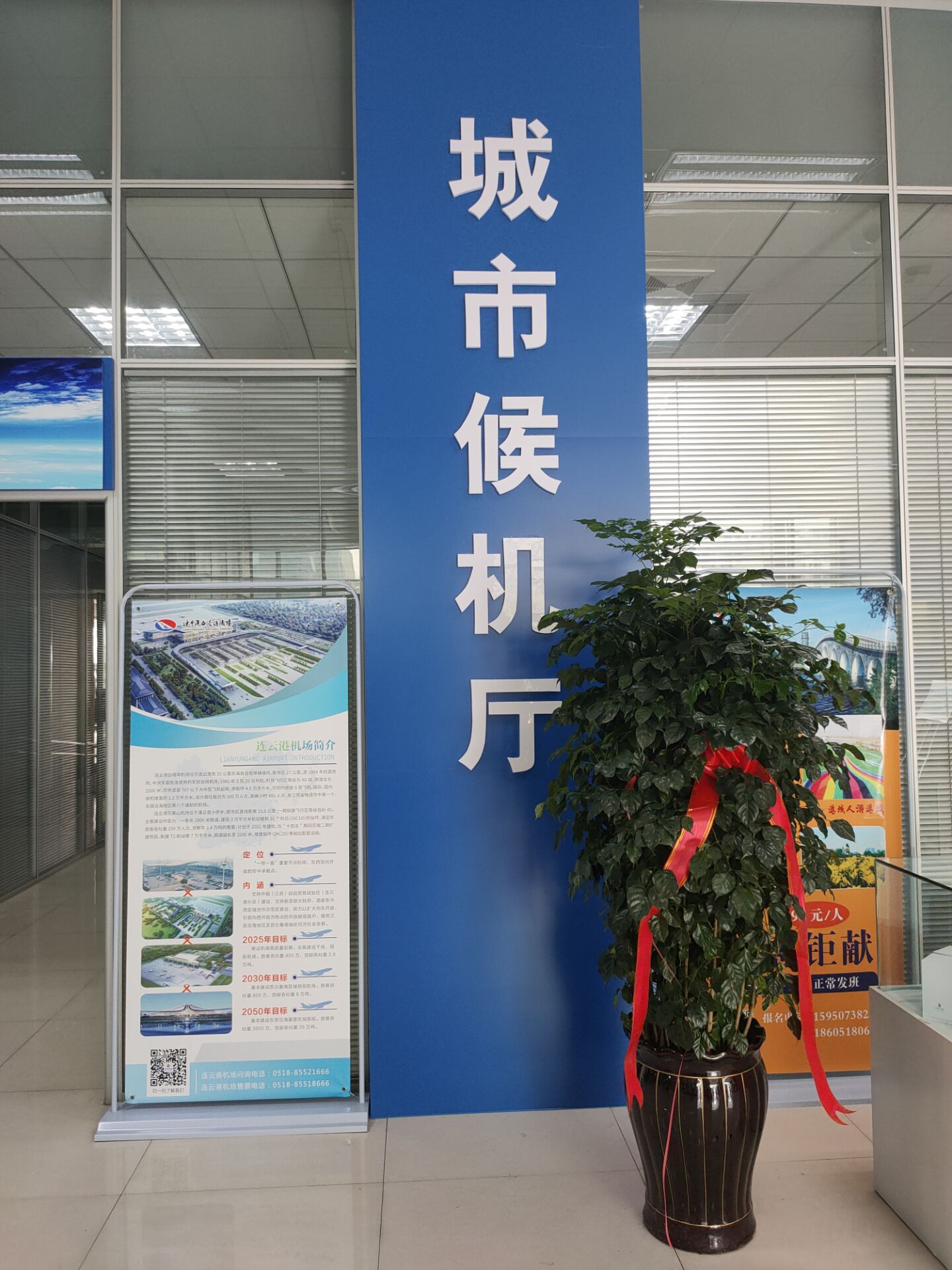 连云港市城市候机厅位于市旅游集散中心内,形成了陆空联运的立体式综合交通运输,进一步完善了集散中心交通换乘的枢纽作用,为旅客出行提供舒适、温馨的服务,现已开通直达连云港白塔埠机场、淮安涟水机场、临沂启阳机场、南京禄口机场、盐城南洋机场、徐州观音机场、青岛流亭机场等多条机场专线,为来连商旅游客提供贴心服务。