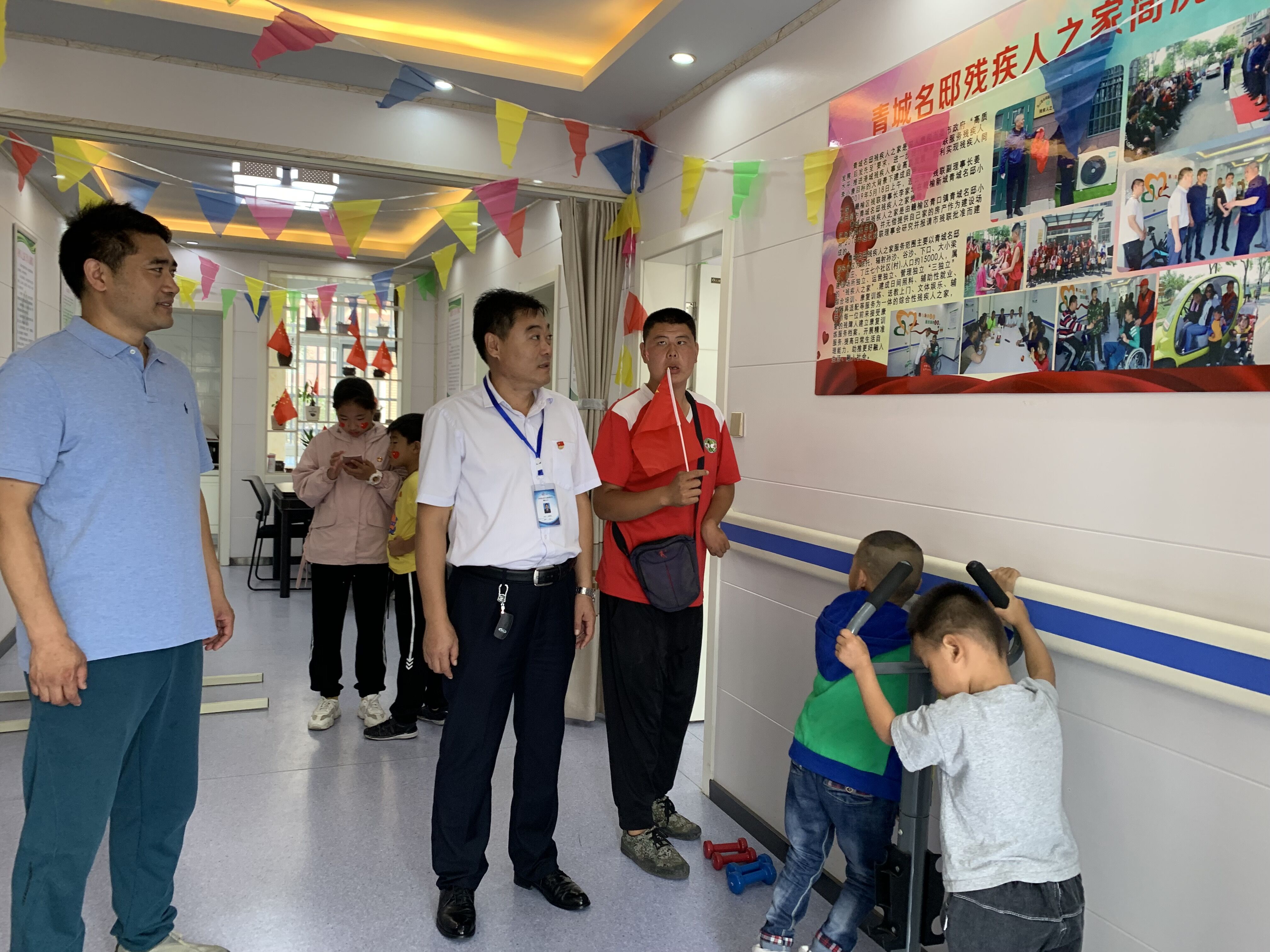 在残疾人之家,高书记帮助残疾儿童做体健、帮扶其行走;对脑瘫患者流出的口水进行认真擦拭,他勉励残疾人要继续保持积极乐观、自强不息、认真生活的态度。于主席告诉小朋友们,今天是祖国的生日,要热爱祖国,并为小朋友贴上国旗小贴纸。