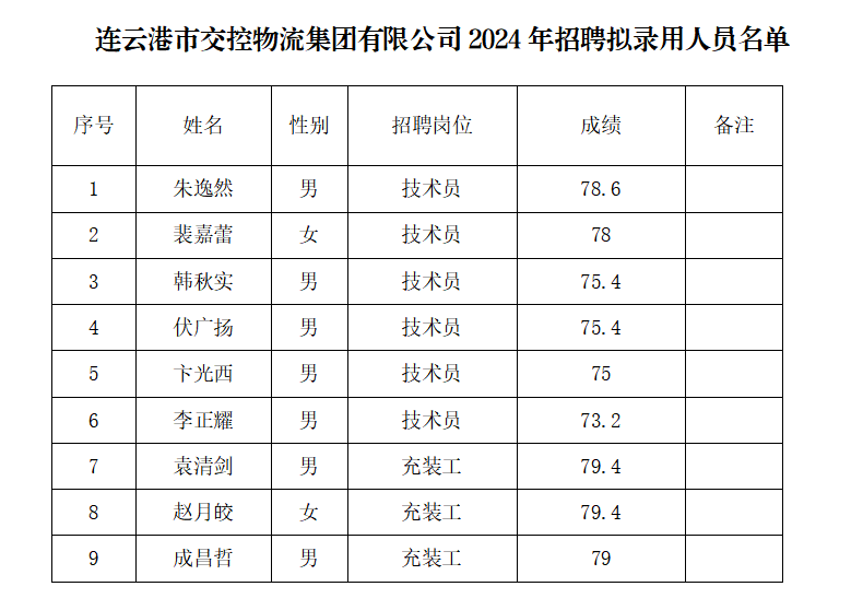 根据连云港市交控物流集团有限公司2024年招聘简章有关规定和要求,现将本次招聘拟录用人员名单予以公示。