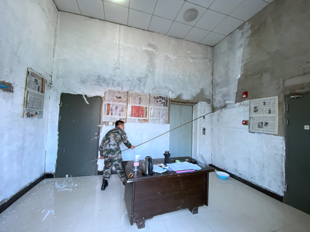在值班任务结束后,本应该休班的李想扛来了梯子,清空留观室里的桌椅,铲墙刷涂料,忙得汗流浃背。滴落的白漆星星点点散布在他的衣服上,他却根本不在意。有人问他:“你不嫌脏怕累吗?”李想却说:“我以前在部队刷过墙面,这点小事和辛苦不算什么,能为单位省点钱,值得!”刷漆累了,他就伸下腰,片刻休息后又投入到忙碌中。就这样,通过辛勤忙碌,墙面焕然一新。出站疫情防控留观室通过验收,顺利达标投入使用。
