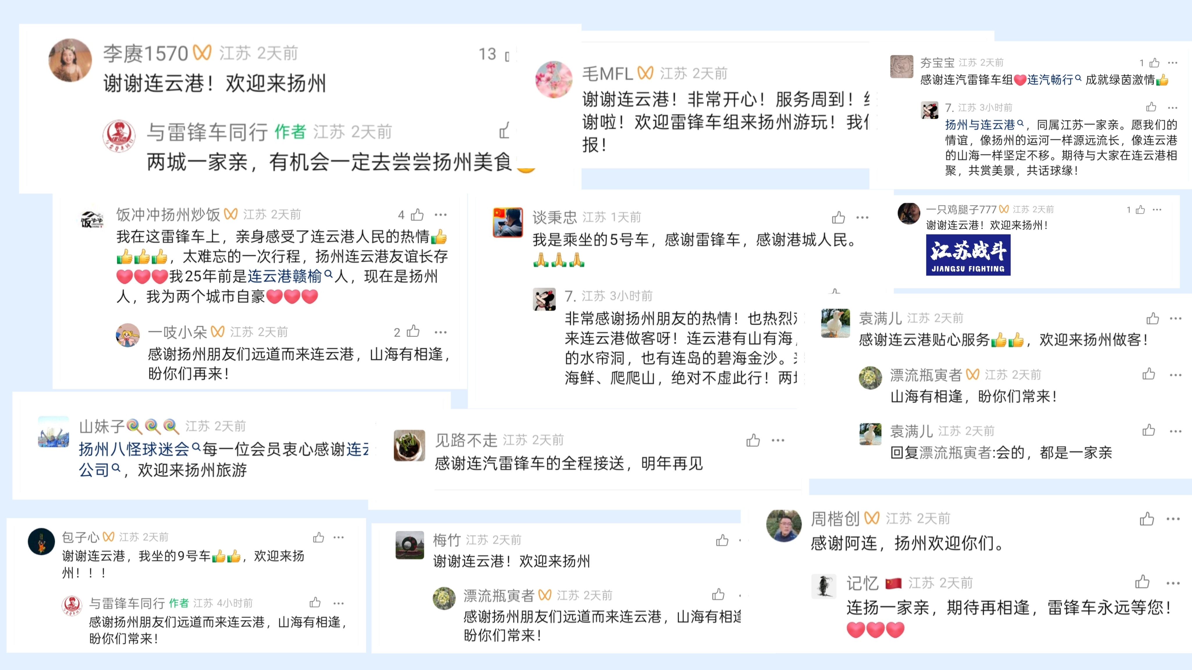 赛事落幕,温暖却在延续。赛后,扬州球迷纷纷在社交平台留下真挚留言,字里行间满是感动与谢意:“谢谢连云港!欢迎来扬州。”“‘雷锋车’让我亲身感受了连云港人民的热情,太难忘的一次行程,扬州连云港友谊长存!”“谢谢连云港!非常开心!服务周到!细致用心!谢谢啦!欢迎‘雷锋车’组来扬州游玩!我们一定热情回报!”“连汽的优质服务必须点赞!阿连‘雷锋车’友谊地久天长!”这些朴实的话语,不仅是球迷对“雷锋车”组服务的认可,更是对连云港城市文明形象的由衷褒奖。