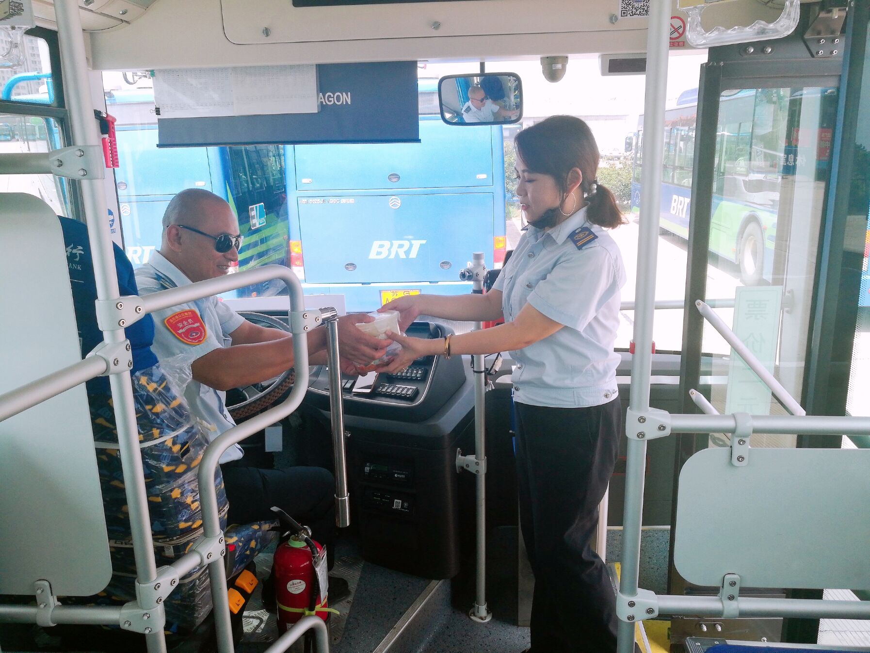 照片中憨厚老实的帅哥驾驶员是我们公交集团快速公司西城分公司B1线的驾驶员姚伟,美女是我们公交集团快速公司一号线工商银行站的站务员董淑艳。