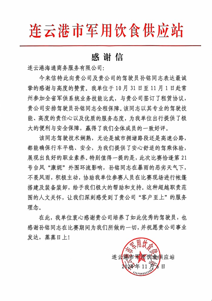 近日,汽服公司权属汽车租赁事业部收到了一封来自连云港市军用饮食供应站的感谢信,信中表达了对租赁事业部政务保障车驾驶员孙铭的感谢与肯定。纸短情长,一封感谢信承载了客户对驾驶员的信任与感激,也传递了汽服公司“客户至上”的服务理念。