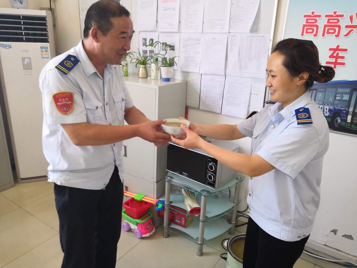 即使是在高温天气,为了保证市民乘客的日常出行,港城的公交人们忍受着高温酷暑依旧坚守岗位,默默地挥洒着汗水。公交集团海通公交公司为切实践行“分公司为一线驾驶员服务”的服务理念,各分公司实行轮流值班制,在线路车辆密集的西城公交停车场,上午10:30左右,公司安排一辆电动车停放场内,车上摆放了简易餐桌和饮用水供驾驶员休息、吃饭使用。