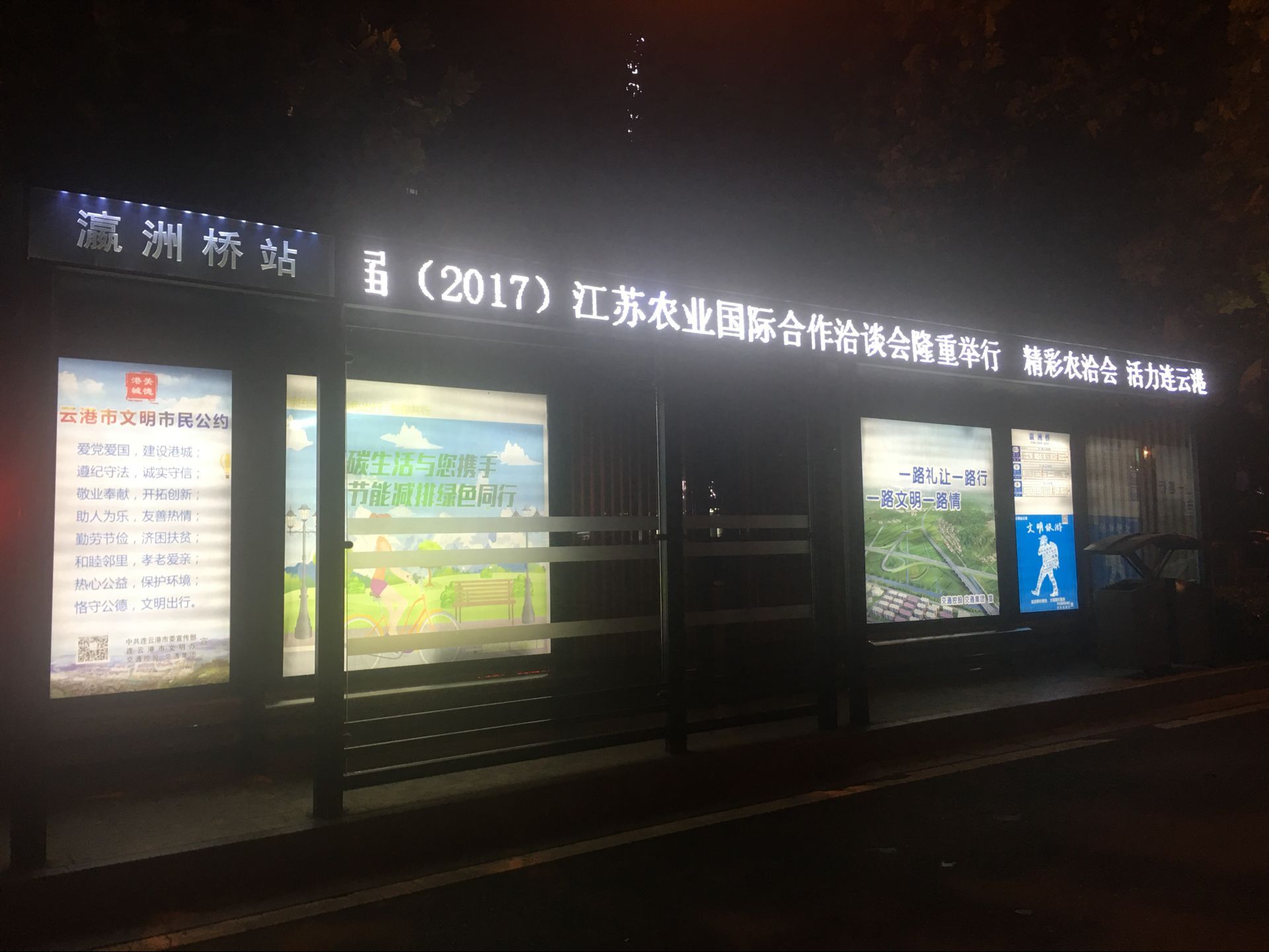 为更好地迎接第四届中国(连云港)丝绸之路国际物流博览会和第十九届(2017)江苏农业国际合作洽谈会的胜利召开,交通集团于昨晚完成了全市300多个常规公交候车亭宣传语更换工作,成为全市第一家完成宣传任务的媒体单位,第一时间助力宣传港城的两大盛会。