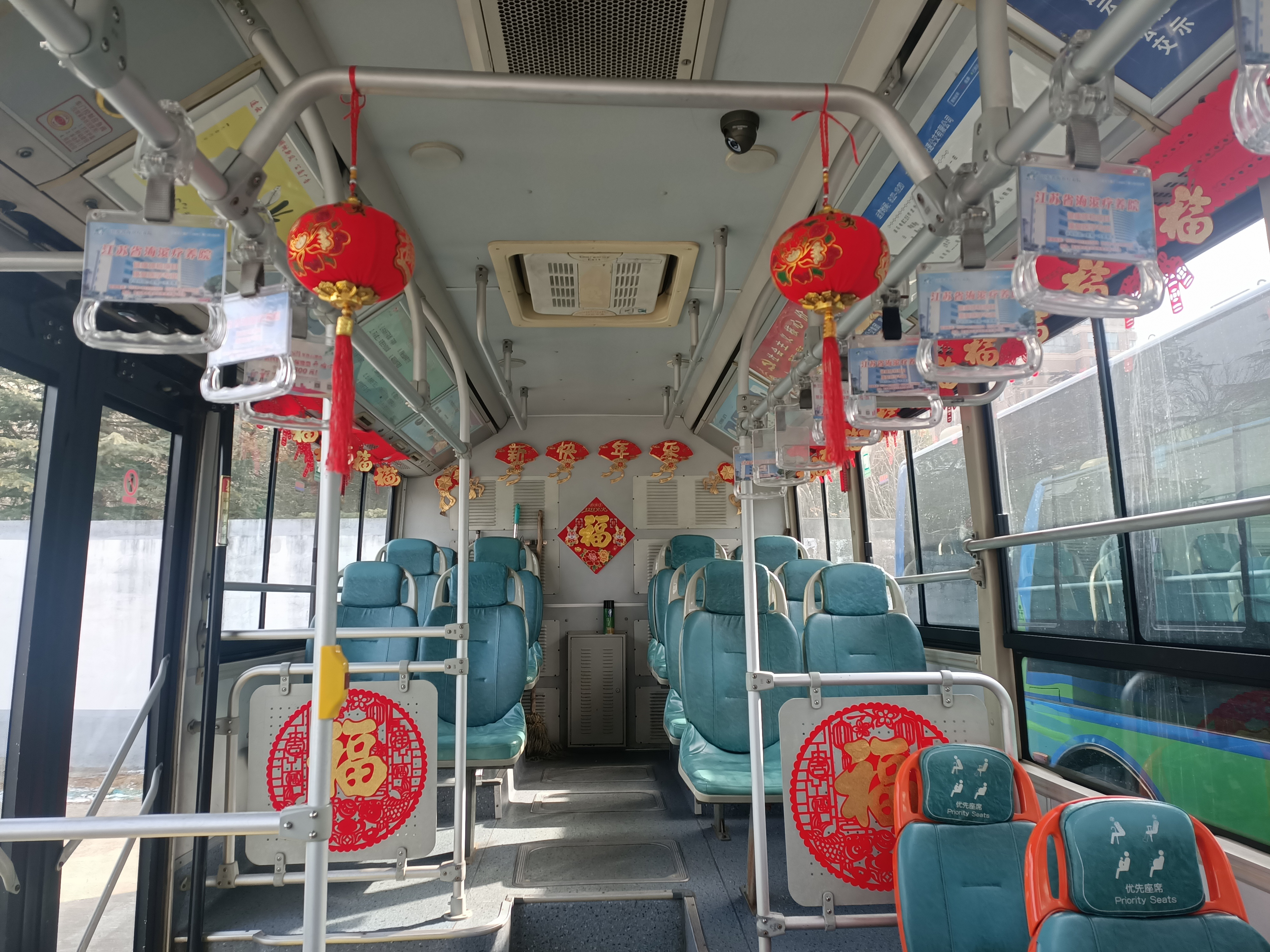 走进新春主题车厢,只见车厢内红火一片,充满了“中国红”的喜庆色彩。车厢顶部两边悬挂着的红色拉花配上金色的“福”字,显得格外喜庆耀眼,金灿灿的“福”字,预示着生活幸福、体健安康。车厢尾部张贴的红色兔年“新年快乐”的装饰和车窗上张贴的可爱俏皮的红色卡通兔子窗花,配上“兔年吉祥”“大吉大利”等吉祥话语,烘托出了满满的节日吉祥氛围,使得车厢内洋溢着一片新年气息,年味十足,让乘车的乘客步入车厢就能感受到浓浓的新年喜庆氛围,公交集团快速公交事业部希望通过这种独特的方式向乘客传递出新年的祝福。