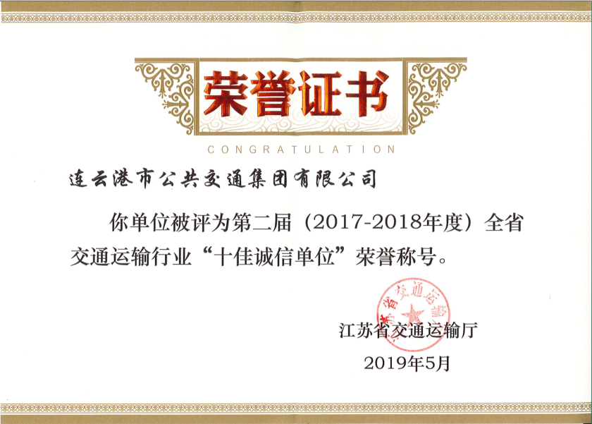 近日,经过严格的比选推荐、材料审核、现场评审等环节,江苏省交通运输厅公布了第二届(2017—2018年度)交通运输行业“十佳诚信单位”名单,连云港市公交集团是江苏省唯一获得此项荣誉的公交企业。