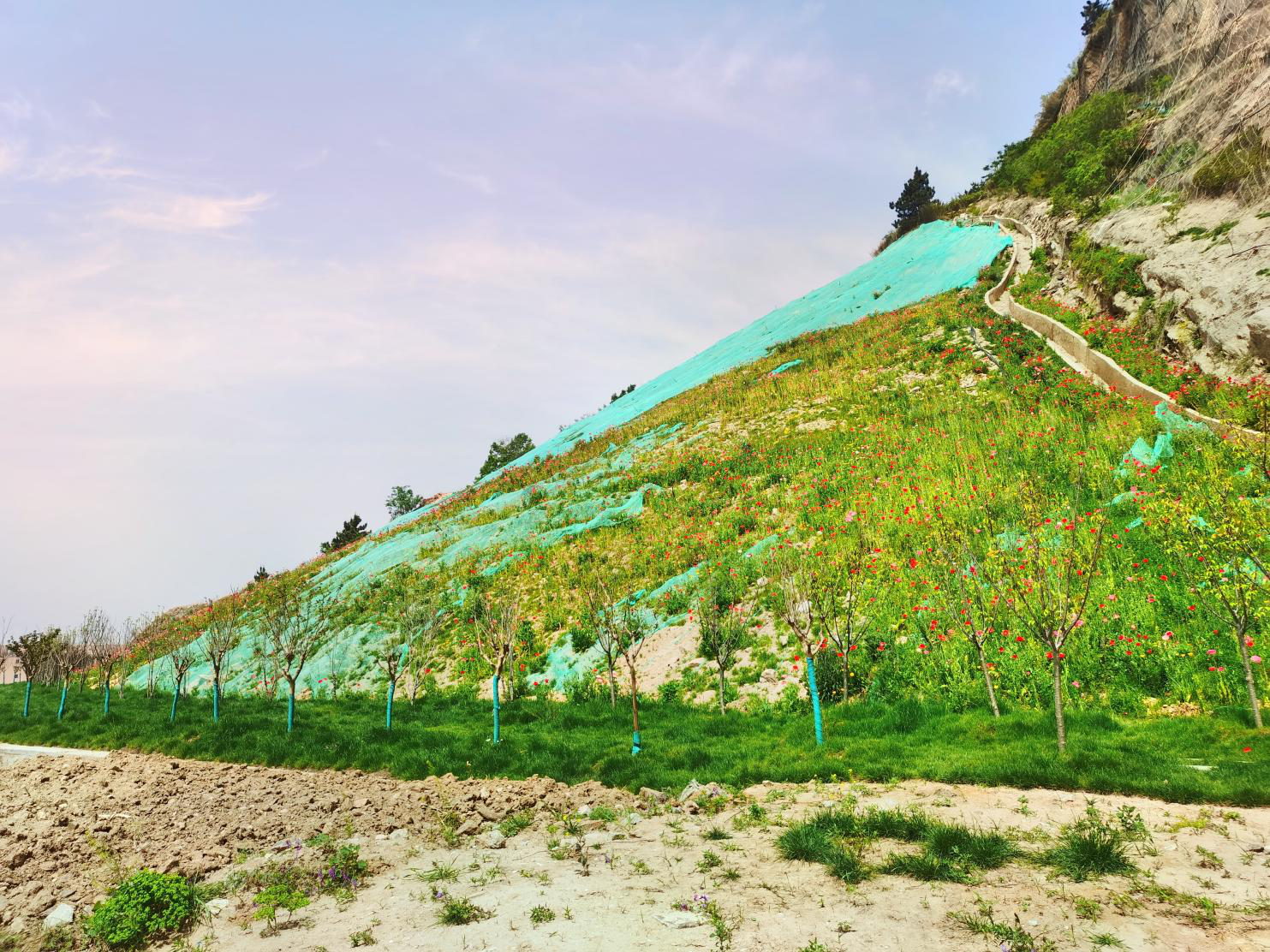 花果山街道采石总厂小村北山宕口项目,由市交通集团投资建设,工程造价约380万元,坡面总面积约 11941.6平方米,坡脚废弃地面积约6983.9平方米。根据项目区边坡地形条件以及治理工艺的不同,治理区分为2个区,采用削坡减载、回填压脚、砌筑挡墙、植被种植等方案,因地制宜的开展区域矿山地质环境治理工作。其中绿化工程山体坡面喷播复绿面积达1.3万平方米,挂设生态袋1万余个,种植榆树、侧柏树、构树各类苗木共2000余株。