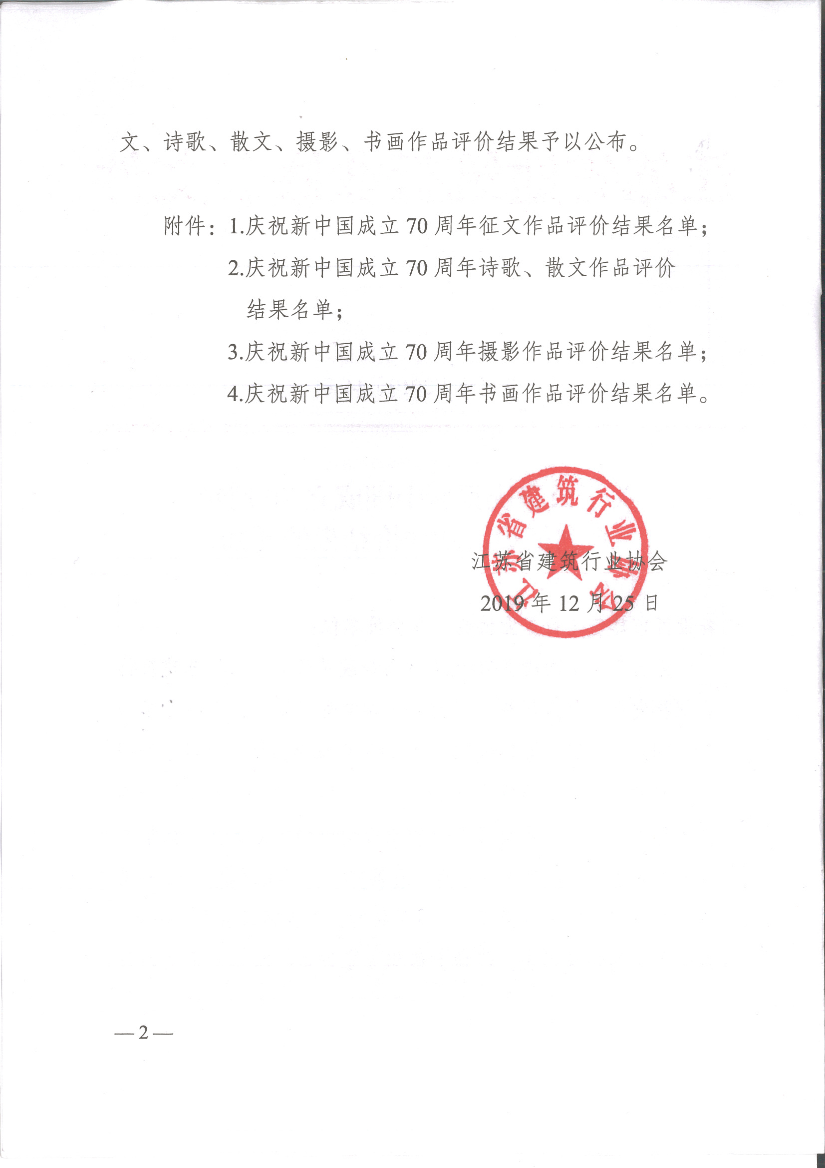 日前,从江苏省建筑行业协会《关于公布庆祝新中国成立70周年系列征集活动评价结果的通知》(苏建协【2019】44号)文件获悉,江苏海通建设工程有限公司的作品《培育和聚集创新要素 高质量推进公司发展》荣获征文作品三等奖。