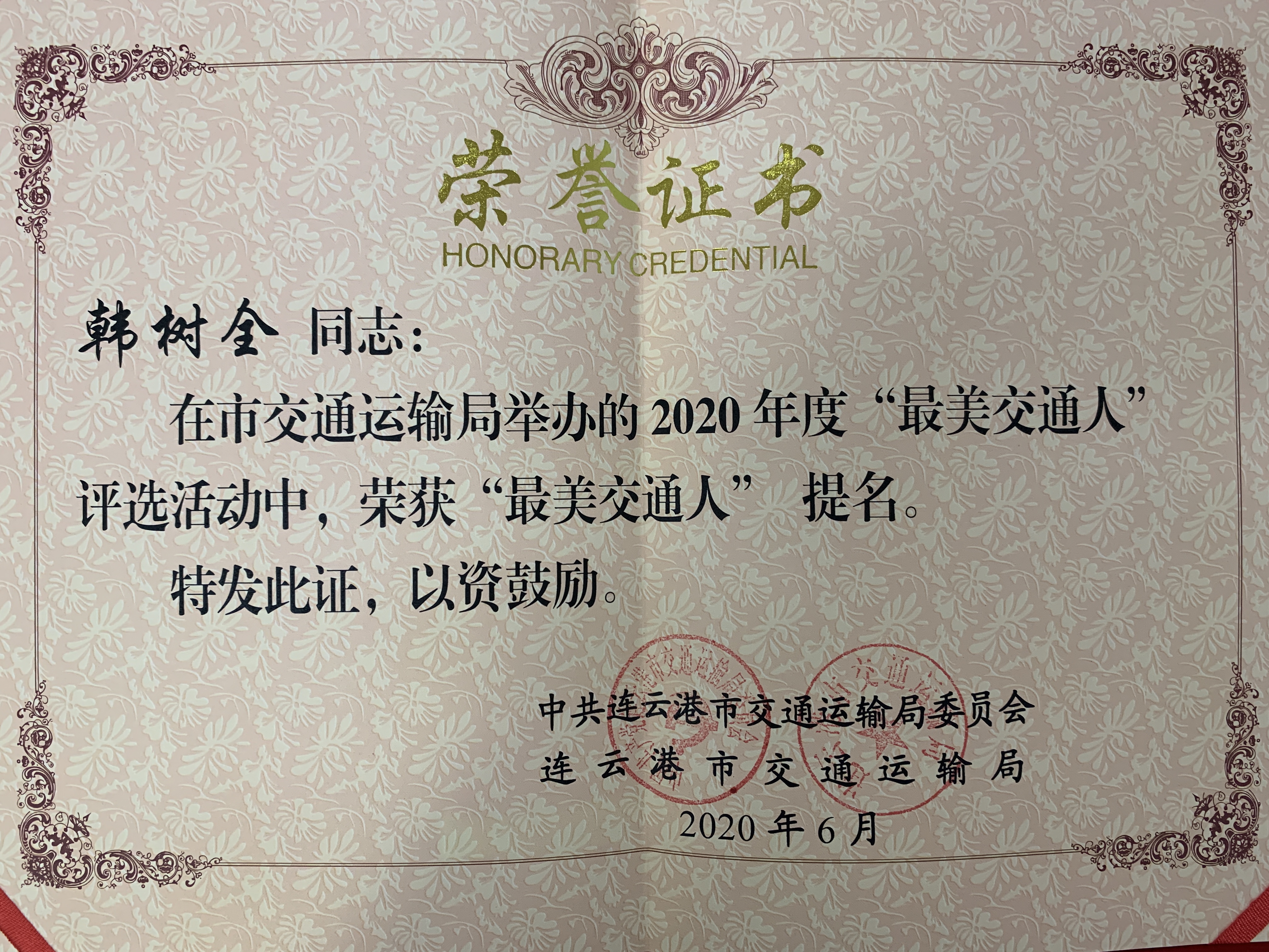 7月8日,在中共连云港市交通运输局委员会、连云港市交通运输局举办的“最美交通人”评比活动中,经过宣传发动、推荐申报、初评筛选、网络投票和专家评审等环节,快客公司驾驶员韩树全同志荣获“最美交通人”提名奖。