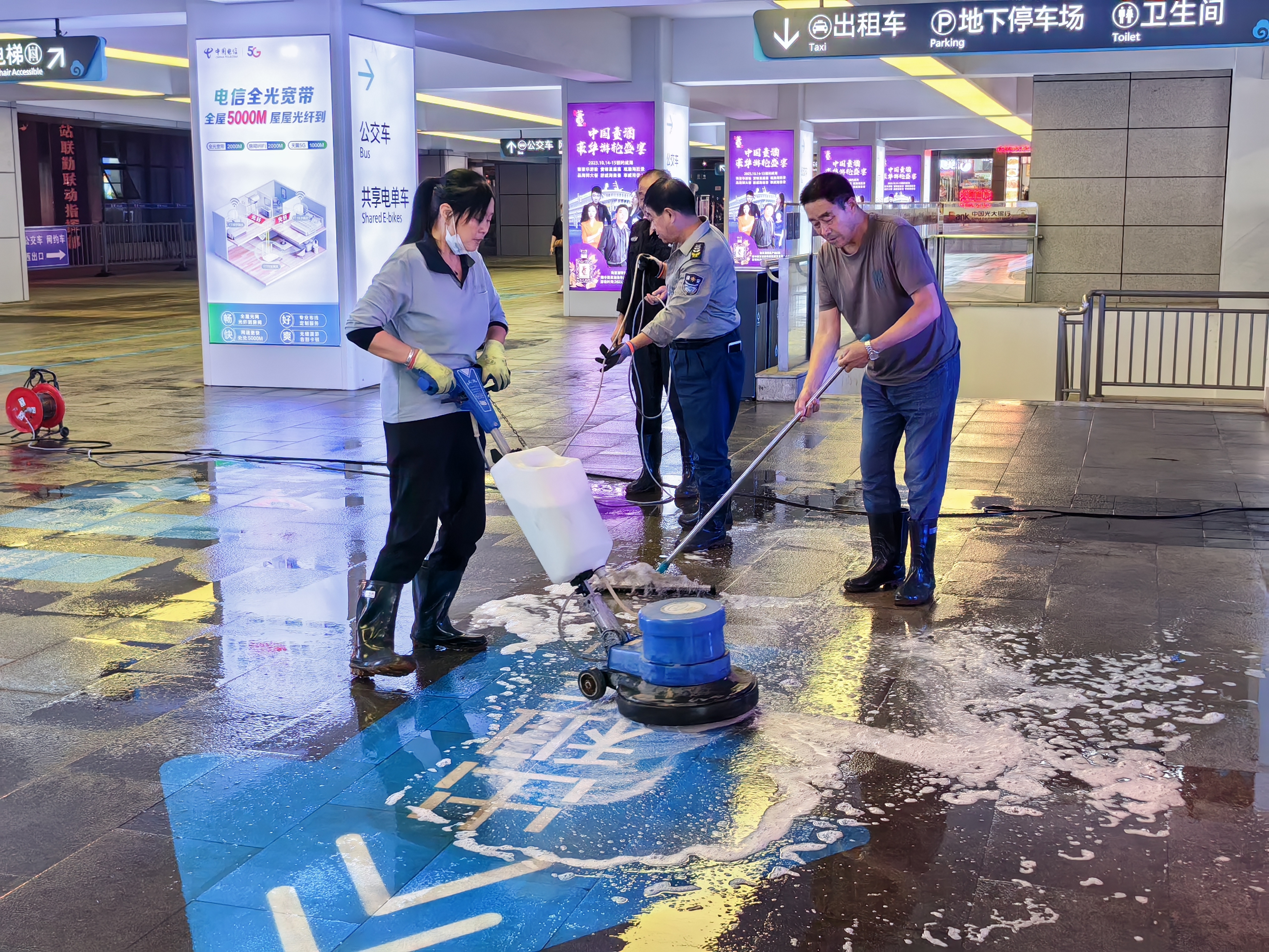 此次整治工作从9月27日开始,综合客运枢纽使用2台洗地机,每天对出站口地面进行仔细清洗,每日清洗600㎡,确保地面干净整洁。此外,还动员了60名保洁人员,分布在P1停车场、出站口、P2停车场、站前广场等重点区域,全天候保障客运枢纽环境卫生。同时,为了加强人流量较大区域的保洁力度,客运枢纽还增派了8名临时保洁人员,要求24小时重点区域时刻有人在岗,