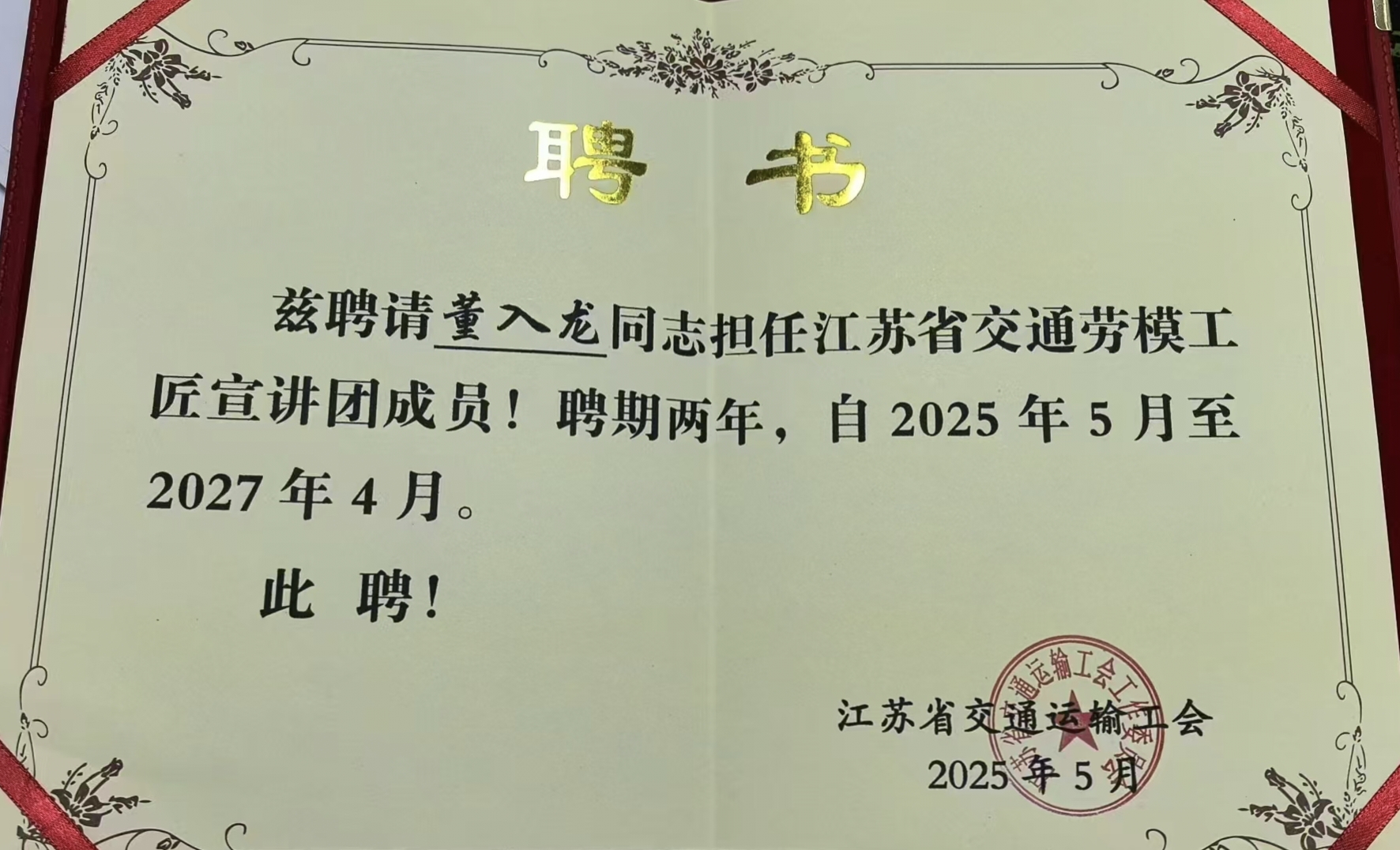近日,江苏省交通劳模工匠宣讲团授聘仪式在市交通运输局隆重举行。公司劳模工匠董入龙荣获授聘书,成为宣讲团的新成员。