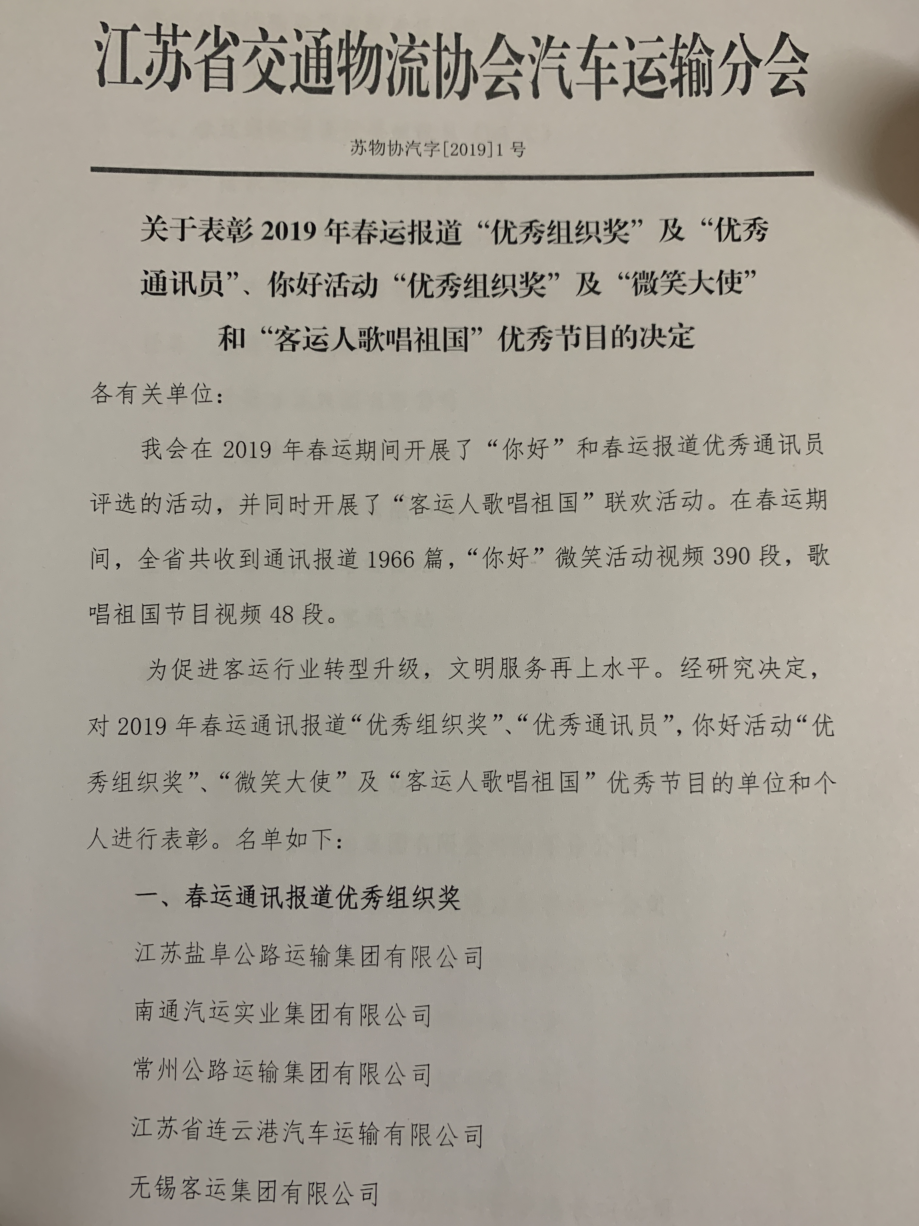 江苏省交通物流协会汽车运输分会为促进客运行业转型升级,提高文明服务水平,充分发挥协会与会员单位联系中的桥梁纽带作用,在2019年春运期间开展了“你好”和春运报道优秀通讯员评选活动,全省多家单位参加了评选。