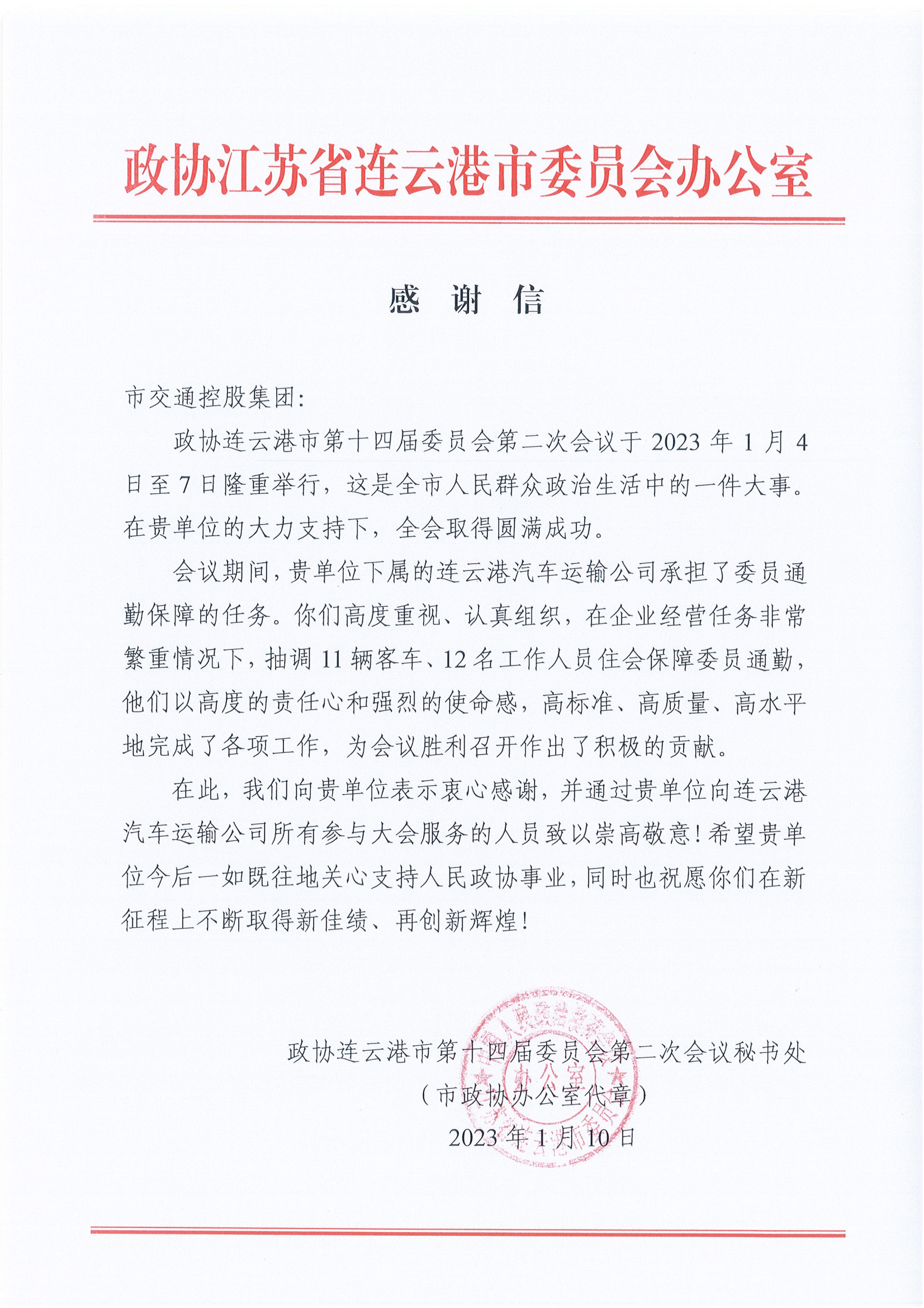 近日,从市交通控股集团获悉,政协连云港市第十四届委员会第二次会议秘书处发来感谢信,对汽车公司在第十四届委员会第二次会议中的交通保障工作表示衷心感谢,对公司所有参与大会服务的人员致以崇高的敬意。