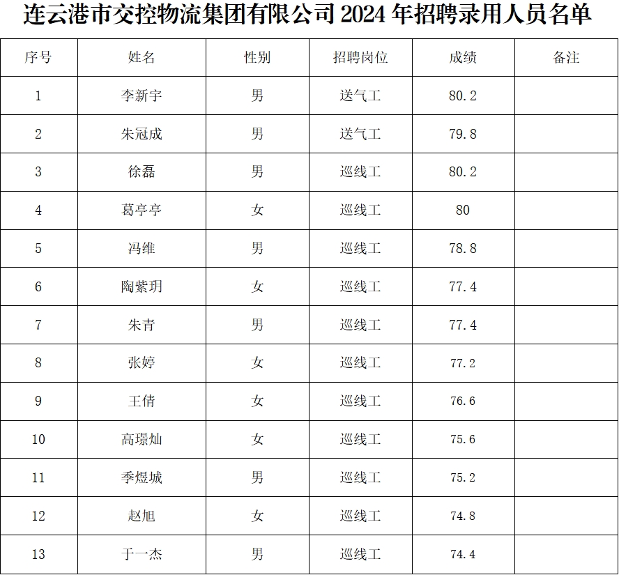 根据连云港市交控物流集团有限公司2024年招聘简章有关规定和要求,现将本次招聘拟录用人员名单予以公示。