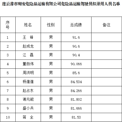 根据连云港市翔安危险品运输有限公司危险品运输驾驶员员招聘公告有关规定和要求,现将本次招聘拟录用人员名单予以公示。