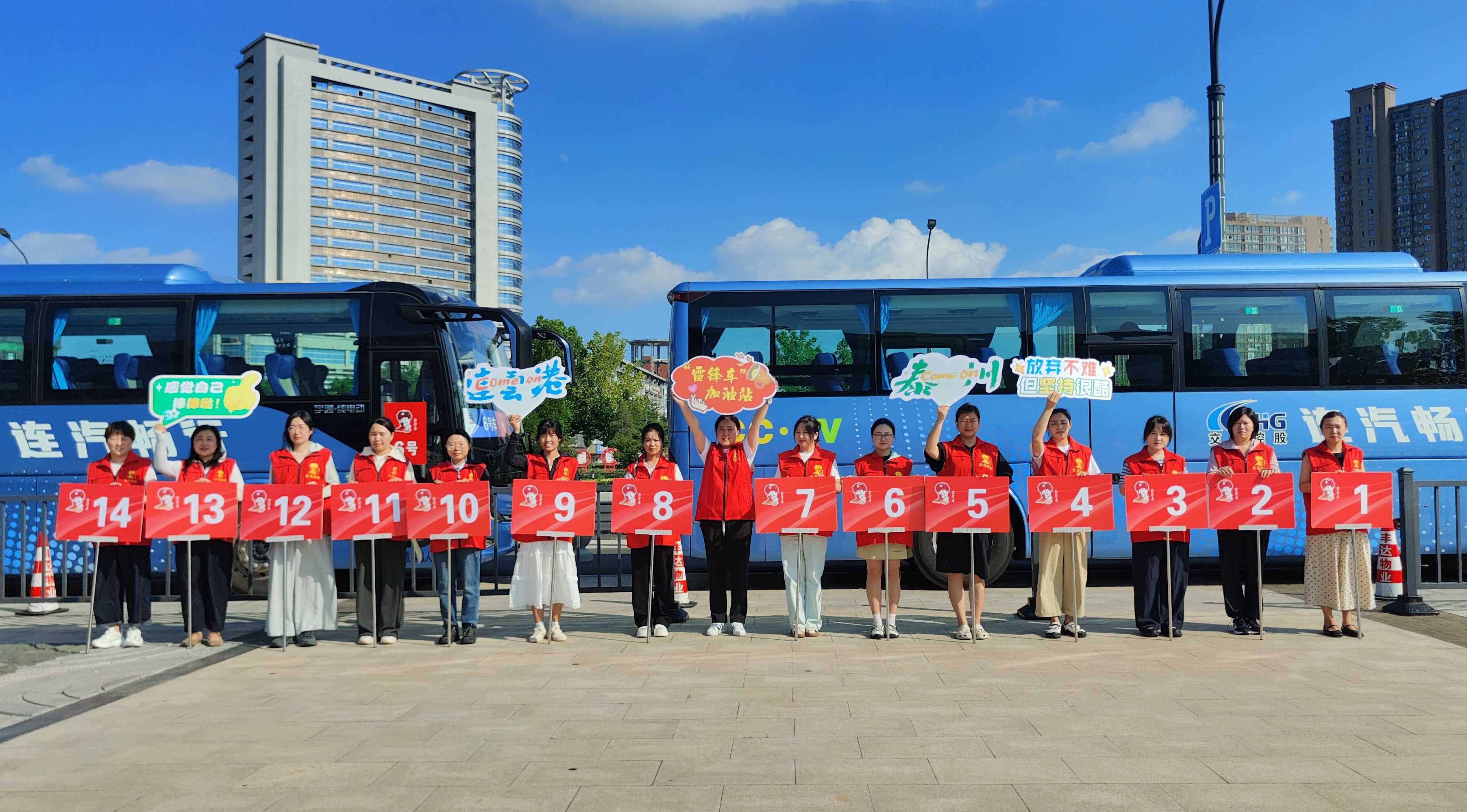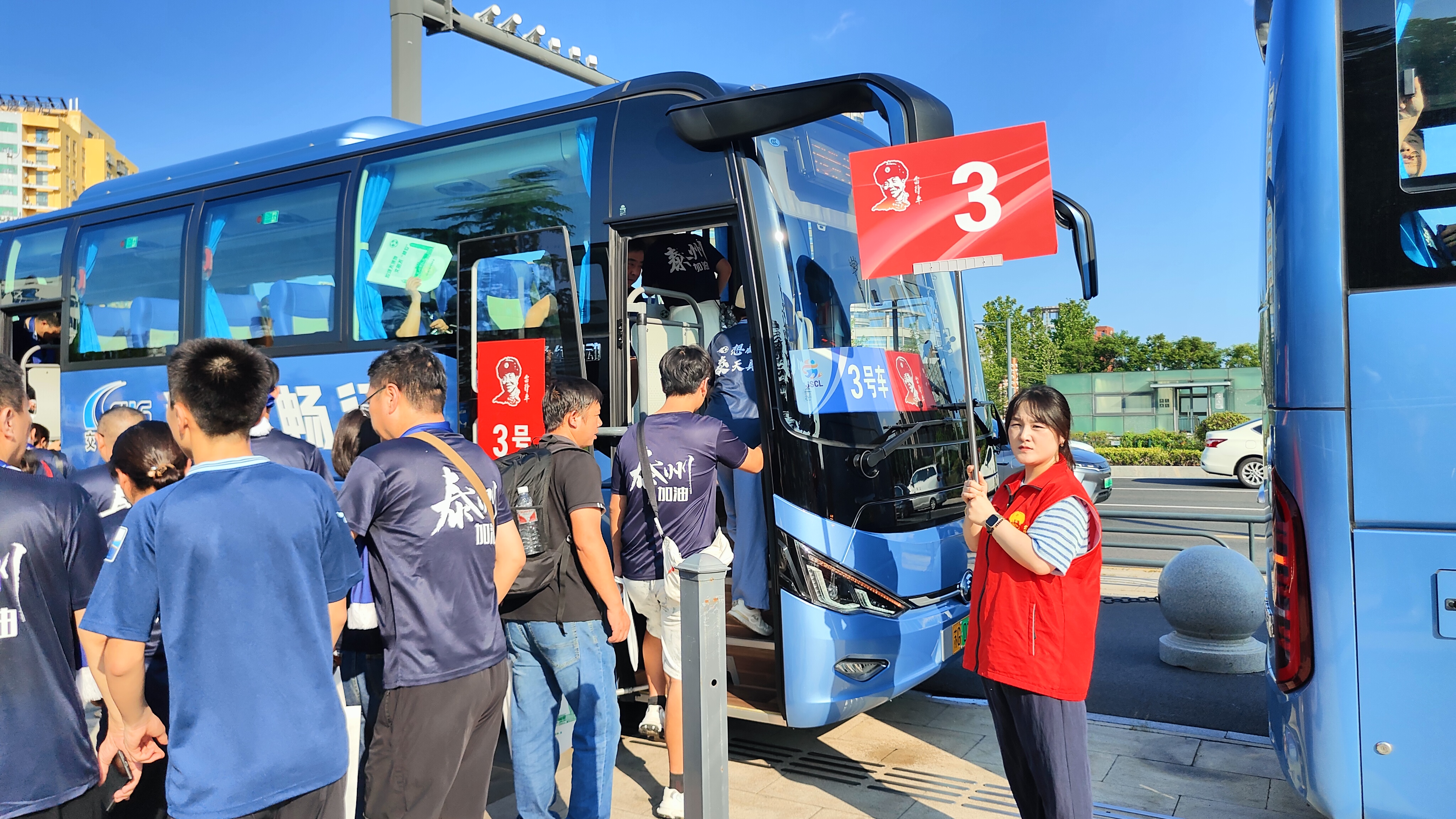 当日下午3点30分,距离首班载有泰州球迷的高铁到站还有一个小时,“雷锋车”手们已在高铁站出站口准备就绪。15辆贴着“‘雷锋车’迎泰州客,山海情暖球迷心”的保障车辆静静等候,车身上的标语在阳光下格外醒目。15名引导员提前熟悉路线,打磨服务细节,她们手持定制的引导指示牌,热情地迎接远道而来的泰州球迷。当球迷们带着观赛的期待走出出站口,“雷锋车”手们主动上前,“您好,这边请,接驳车就在外面”“跟着牌子走,两分钟就能到”……亲切的话语和周到的服务瞬间驱散了客队球迷们的迷茫和不安,不少球迷笑着说:“刚下高铁就被这份热情暖到了,连云港人真贴心!”
